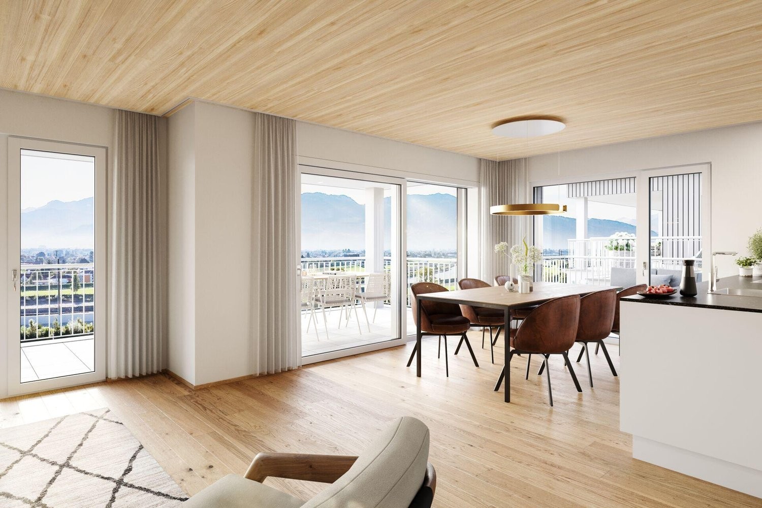 Heller und offener Wohn-, Ess- und Kochbereich mit direktem Zugang zu Terrasse und Sitzplatz