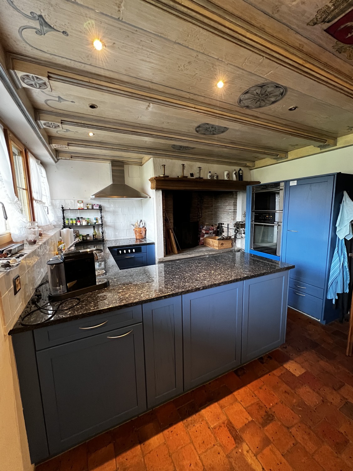 1. 0G: Stilvolles Wohnzimmer, Küche mit hochwertigem Steinofen, praktisches Réduit im Freien, komfortables Schlafzimmer und Badezimmer mit Dusche