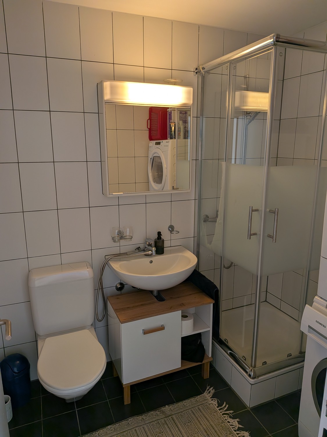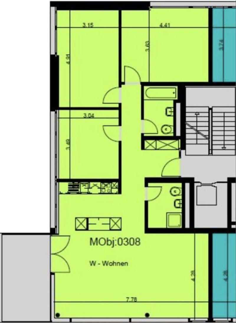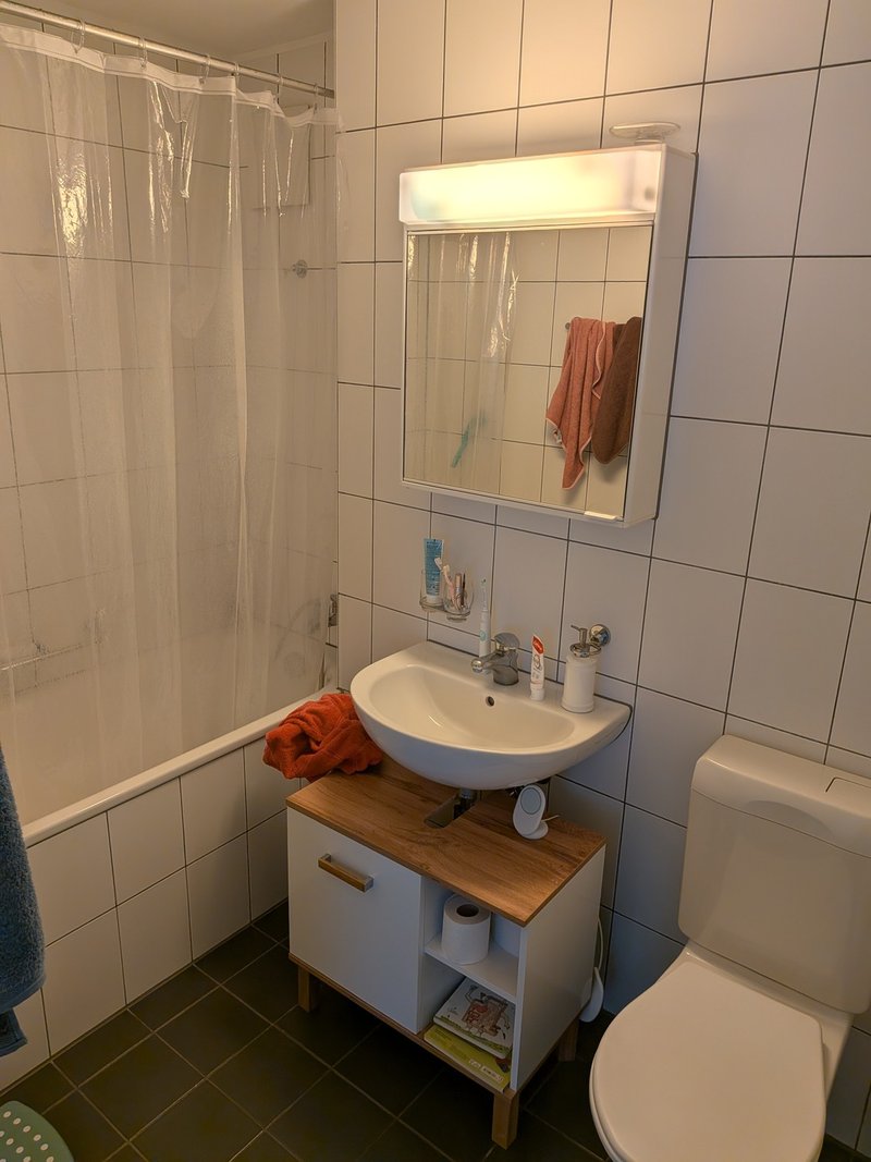 Die Wohnung hat einen sehr grosszügigen, hellen Wohn-Essbereich mit anschliessender Küche mit Durchreiche und ist komplett mit Parkett ausgelegt. Sie hat einen grossen Balkon, den wir mit Steinplatten ausgelegt haben, die die Nachmieter*in gerne übernehmen kann. Sie hat zwei grosse Zimmer mit bodentiefen Fenstern und ein kleineres Zimmer. Es hat zwei Badezimmer, eines mit Badewanne und eines mit Dusche, bei der wir selber eine Duschkabine angebracht haben, die die Nachmieter*in auch gerne übernehmen kann. Im Badezimmer 2 hat es Anschlüsse für einen Waschturm, der aber nicht von der Verwaltung zur Verfügung gestellt wird, es hat eine Waschküche, die die 9 Wohnungen im Haus gemeinsam benutzen. Es hat einen Einbauschrank im Eingangsbereich.