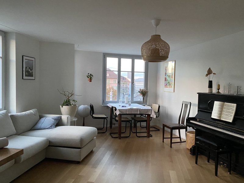 Die Wohnung ist wunderschön, ein altes Haus, neu renoviert. Es gibt ein großes Wohn/ Esszimmer, welches schön hell ist und einen herrlichen Blick auf den Bullingerplatz und Prime Tower hat. Dann gibt es zwei Zimmer, und ein Bad mit Dusche und WC sowie Waschmaschine/Trockner sowie ein extra WC und einen Keller.