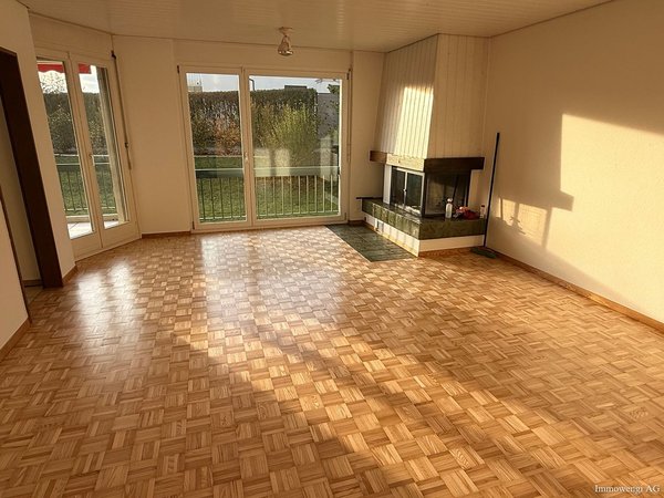 Diese einladende Erdgeschosswohnung bietet ein besonders angenehmes Wohngefühl: viel Licht, grosszügige Räume und ein Wohnzimmer, das mit seinem Eichenparkett und dem Warmluftcheminée sofort Wärme und Behaglichkeit ausstrahlt.