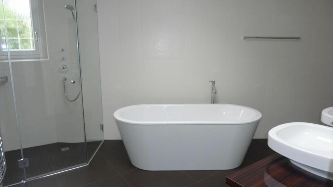 grosses Badezimmer mit freistehender Badewanne, Dusche und Doppellavabo
