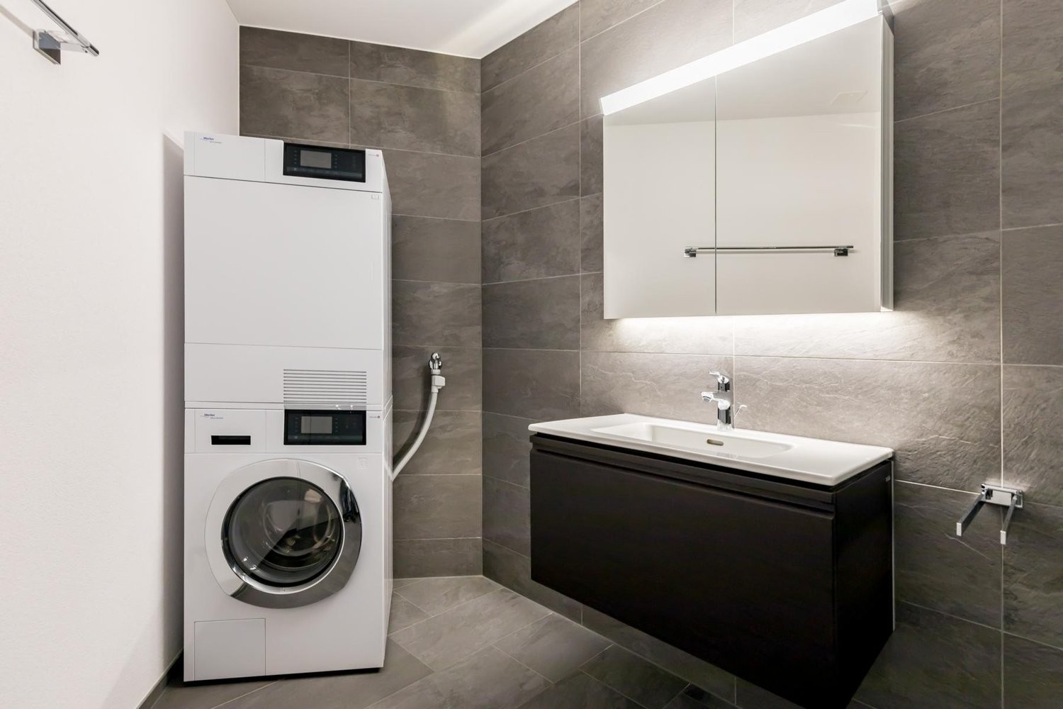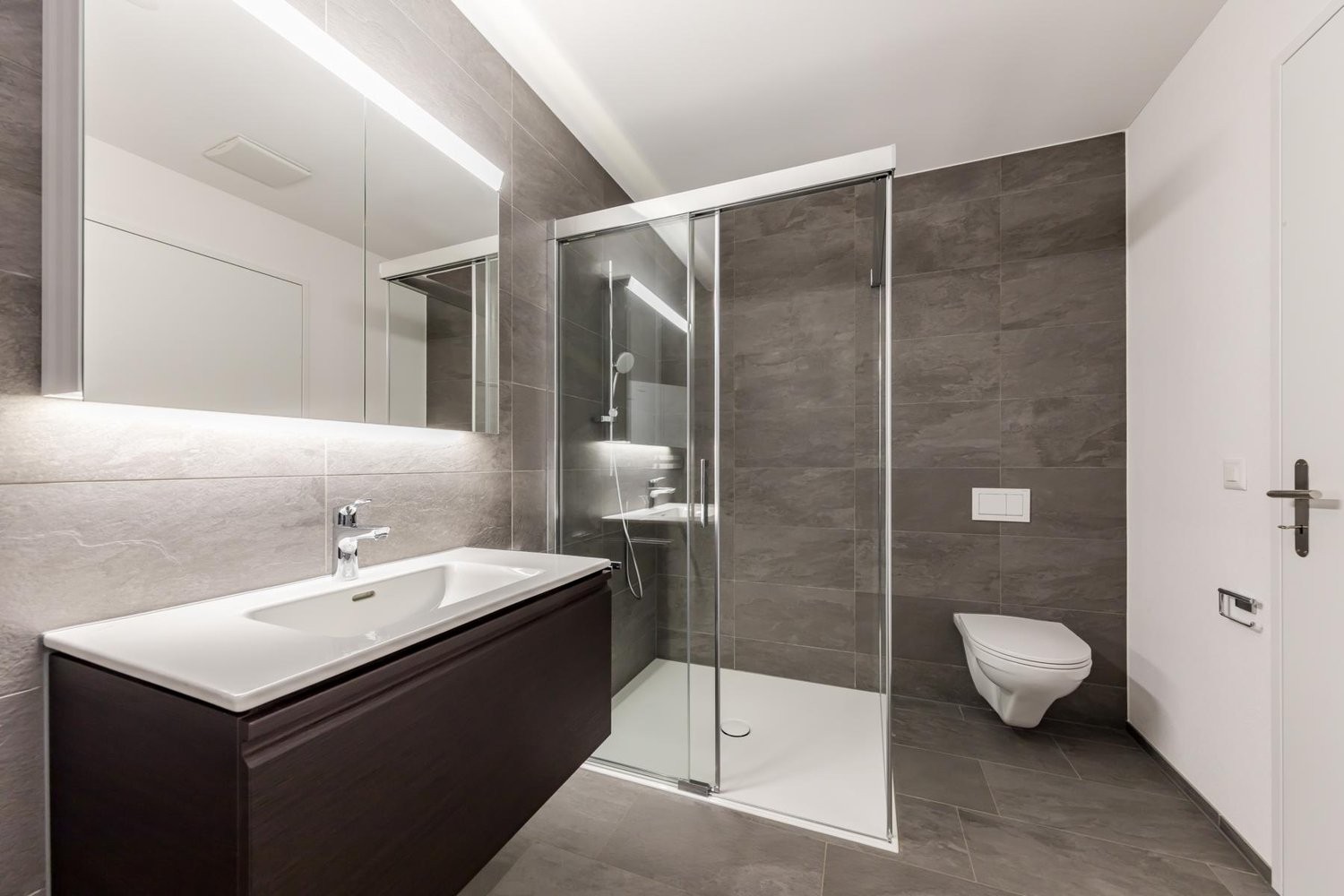 - Nassräume: Wände mit Feinsteinzeugplatten grau, keramikweisse Sanitärapparate, Trennwand aus Echtglas, Spiegelschrank mit LED, Unterbaumöbel Beleuchtung