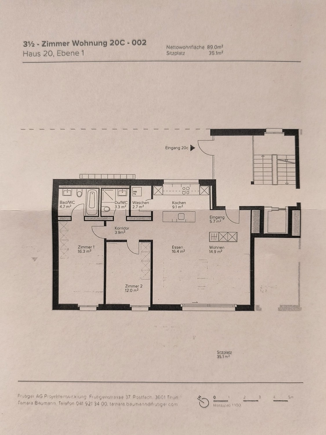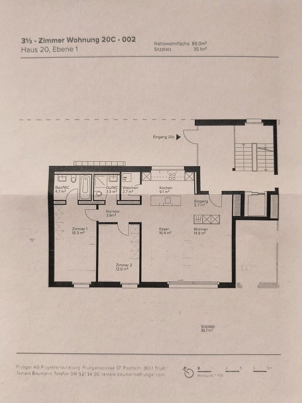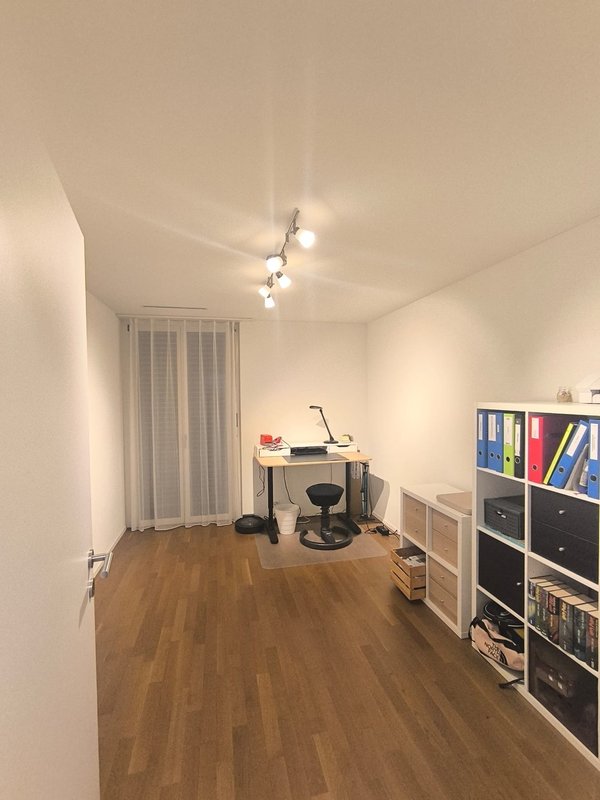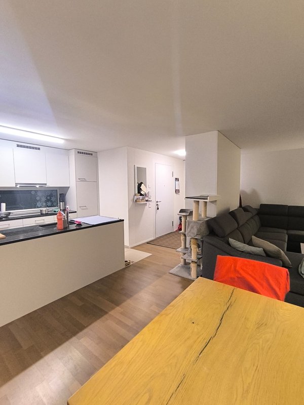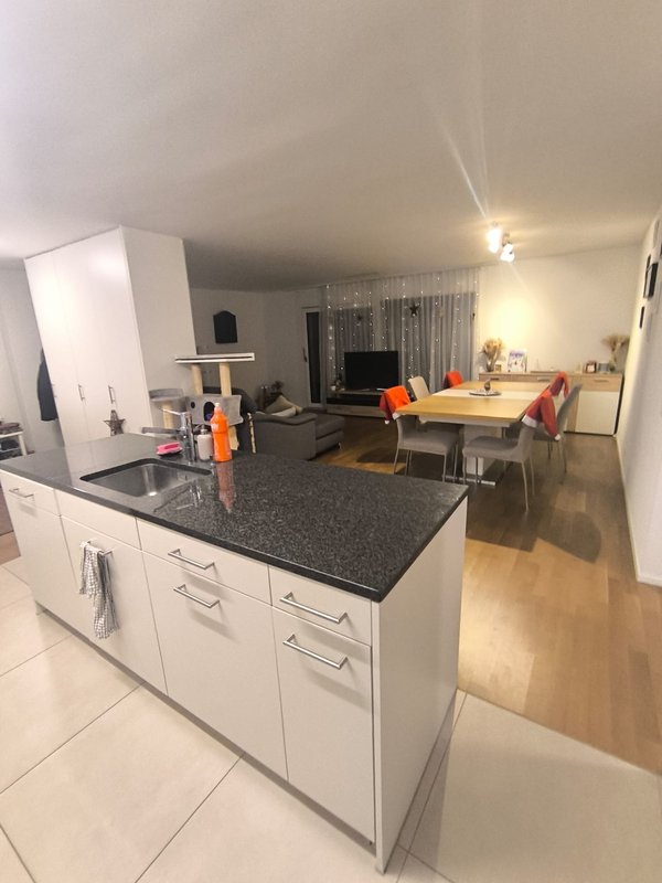 Moderne 3.5-Zimmer-Wohnung in Minergie-Bauweise mit grosszügiger Terrasse über die gesamte Wohnungslänge. Die Wohnung verfügt über zwei Badezimmer (Dusche und Badewanne), ein Reduit mit Waschturm sowie eine Küche mit kombiniertem Backofen/Steamer.