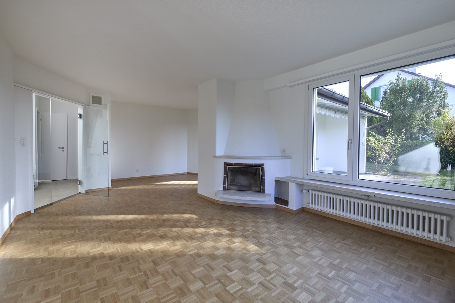 Der Haupteingang führt in einen hellen, abgeschlossenen Entréebereich mit Garderobe, der sofort ein Gefühl von Willkommen vermittelt. Im Wohnzimmer sorgen grosszügige Fensterfronten und das Cheminée für eine warme und einladende Atmosphäre. Die fliessende Raumgestaltung schafft harmonische Übergänge zwischen Wohnen, Halle und Essbereich.