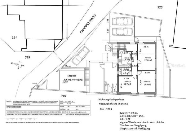 Zur Wohnung gehört ein eigener Parkplatz und ist im Preis inbegriffen. Ein gemeinsam nutzbarer Aussenbereich erlaubt Ihnen Zusammensein, Bräteln, Sonnenuntergang und Feierabend geniessen, oder einfach nur sein.