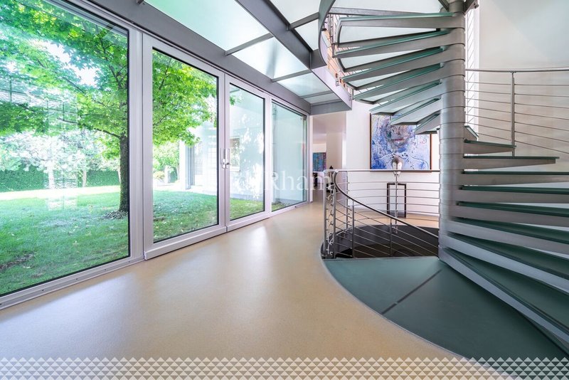 La surface habitable d'environ 430 m2 est répartie en deux allées, dites "Cubes", et sur deux niveaux hors sol (+ sous-sol aménagé d'environ 150 m2). Un escalier en colimaçon ainsi qu'une cour intérieure siègent au centre. Cette distribution ingénieuse offre de nombreuses possibilités et opportunités d'aménagement.