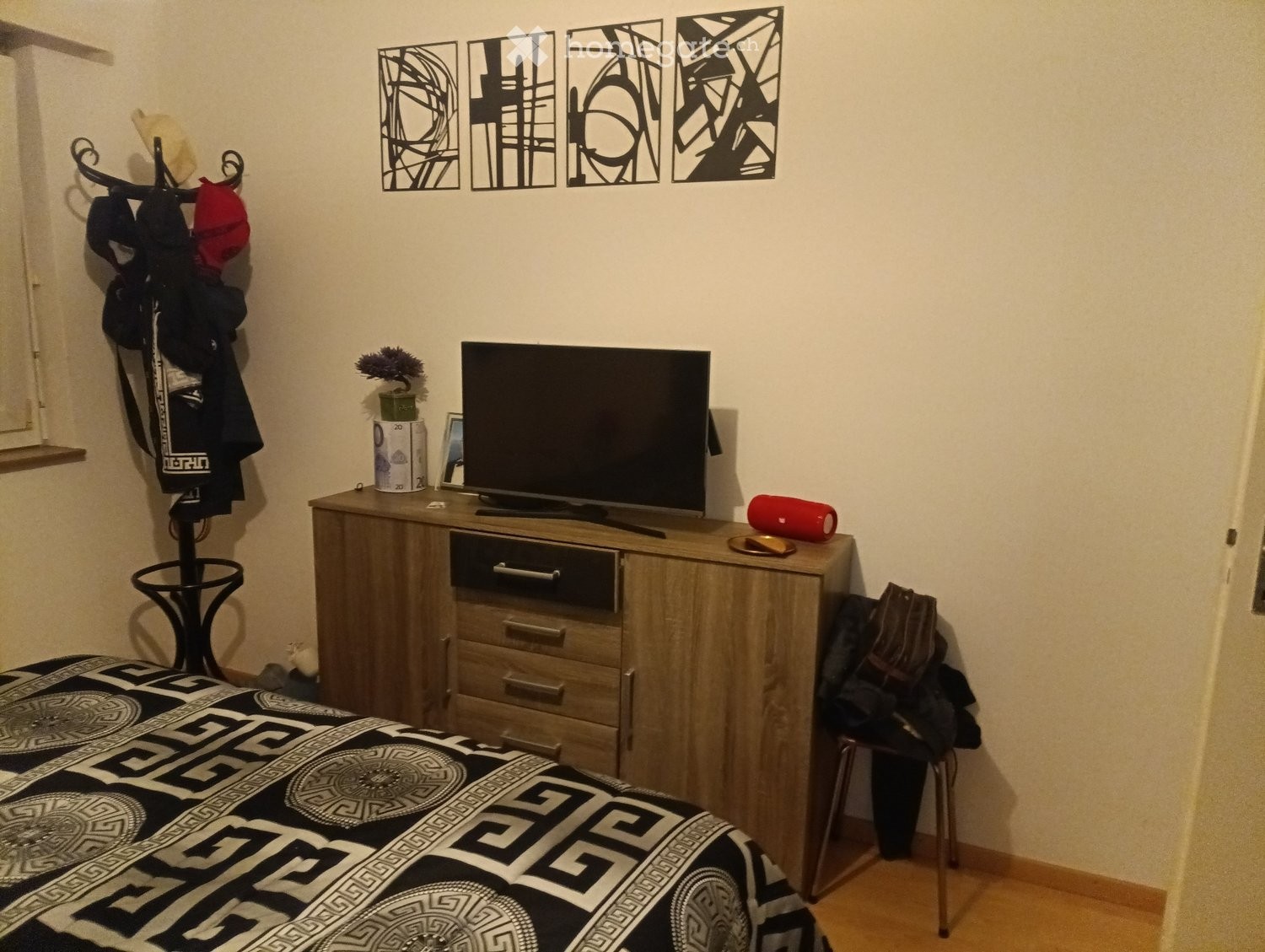 Équipements : lit double, grande armoire avec miroir, commode, télévision et rangements.