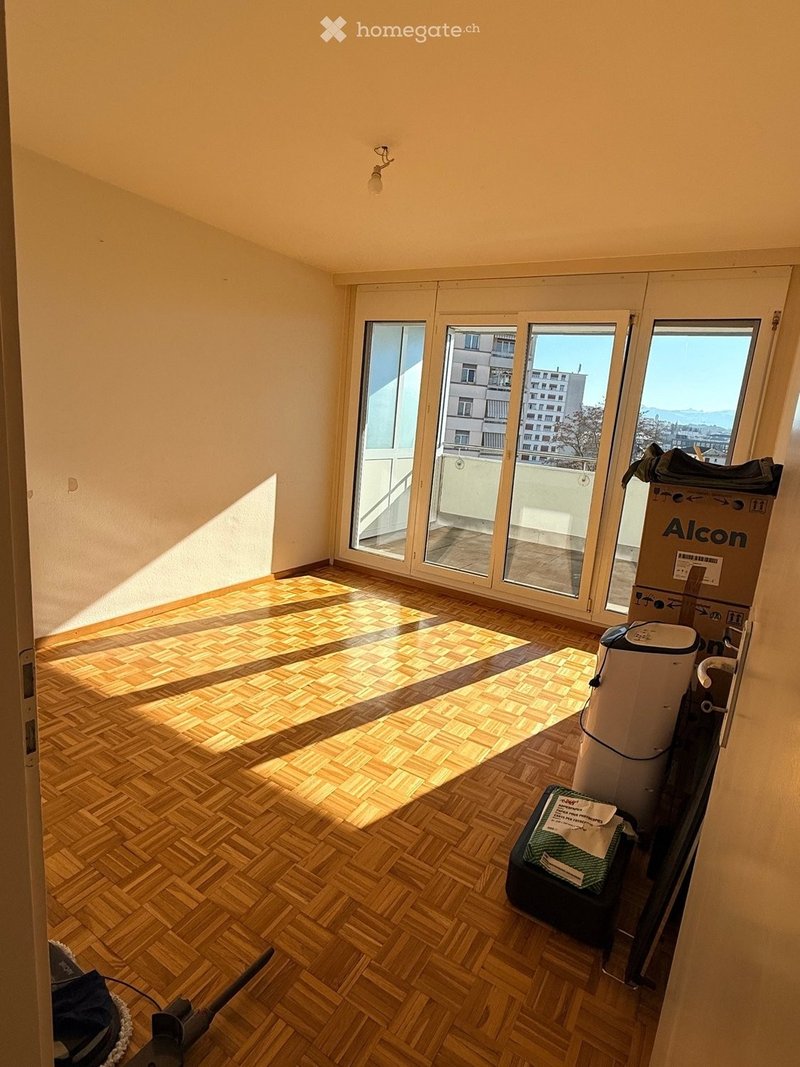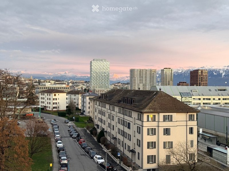 Vu panoramique sur le lac et les montagnes, école à proximité ainsi que les transports (métro, train, bus et bientôt le tram), commerce en face de l immeuble.