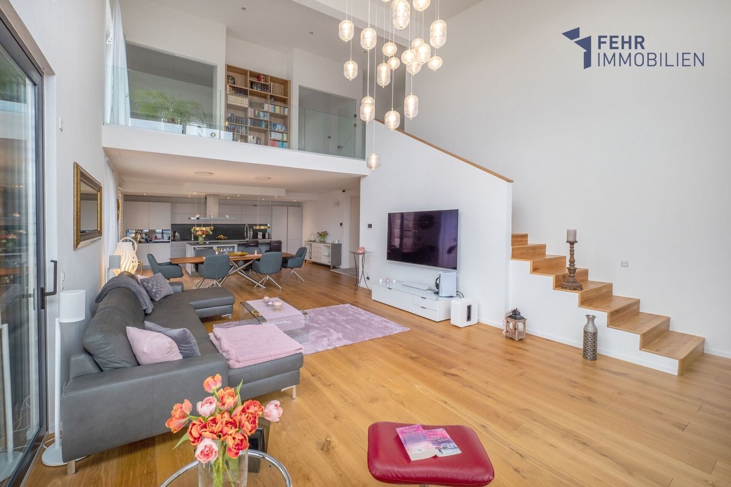 Der gesamte Wohn-/Essbereich verfügt über einen zeitlosen Eichenparkett und wirkt dank seines Volumens und der grosszügigen Fensteröffnungen freundlich und lichterfüllt. Von hier erreichen Sie die Terrasse oder die Galerie im Obergeschoss.