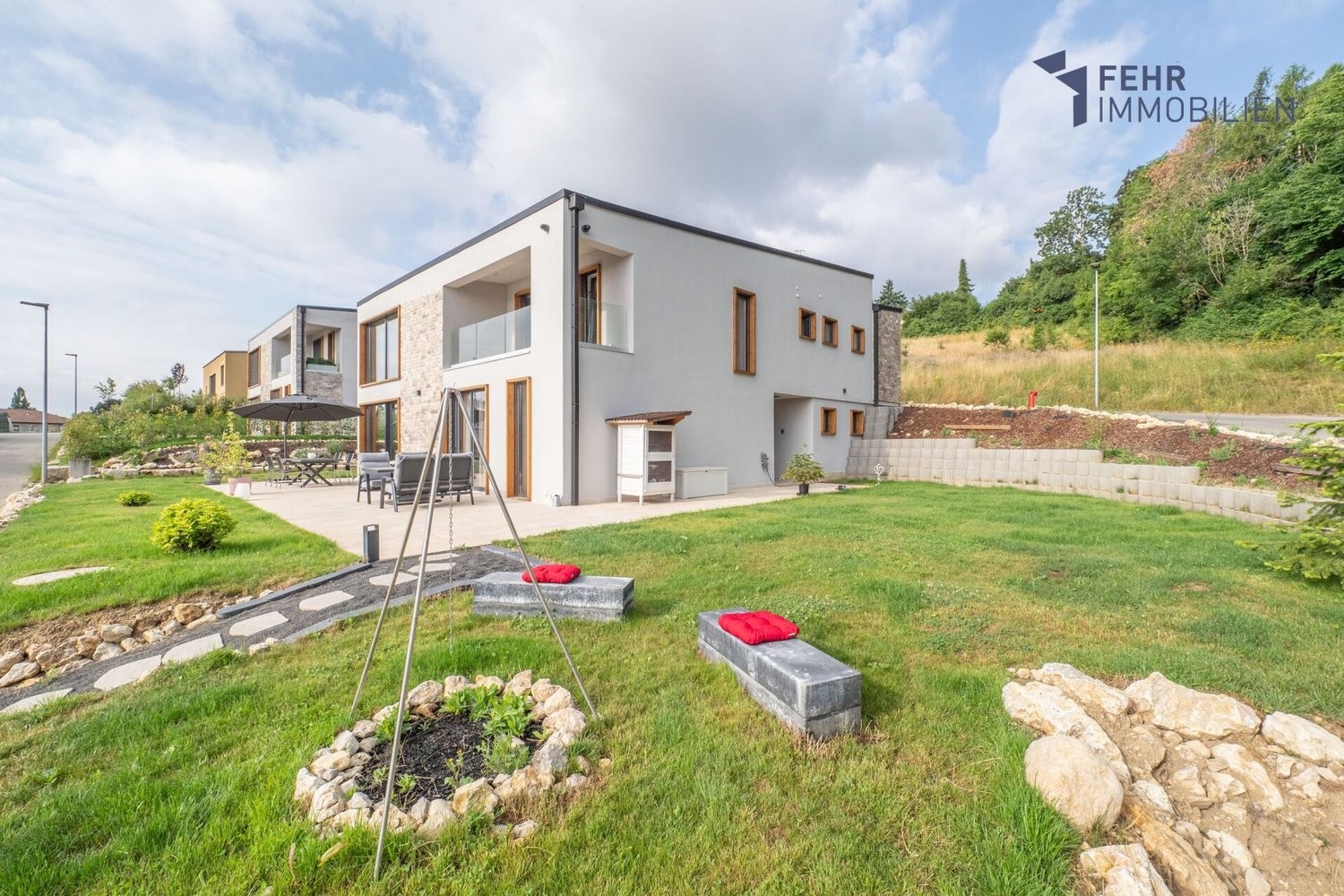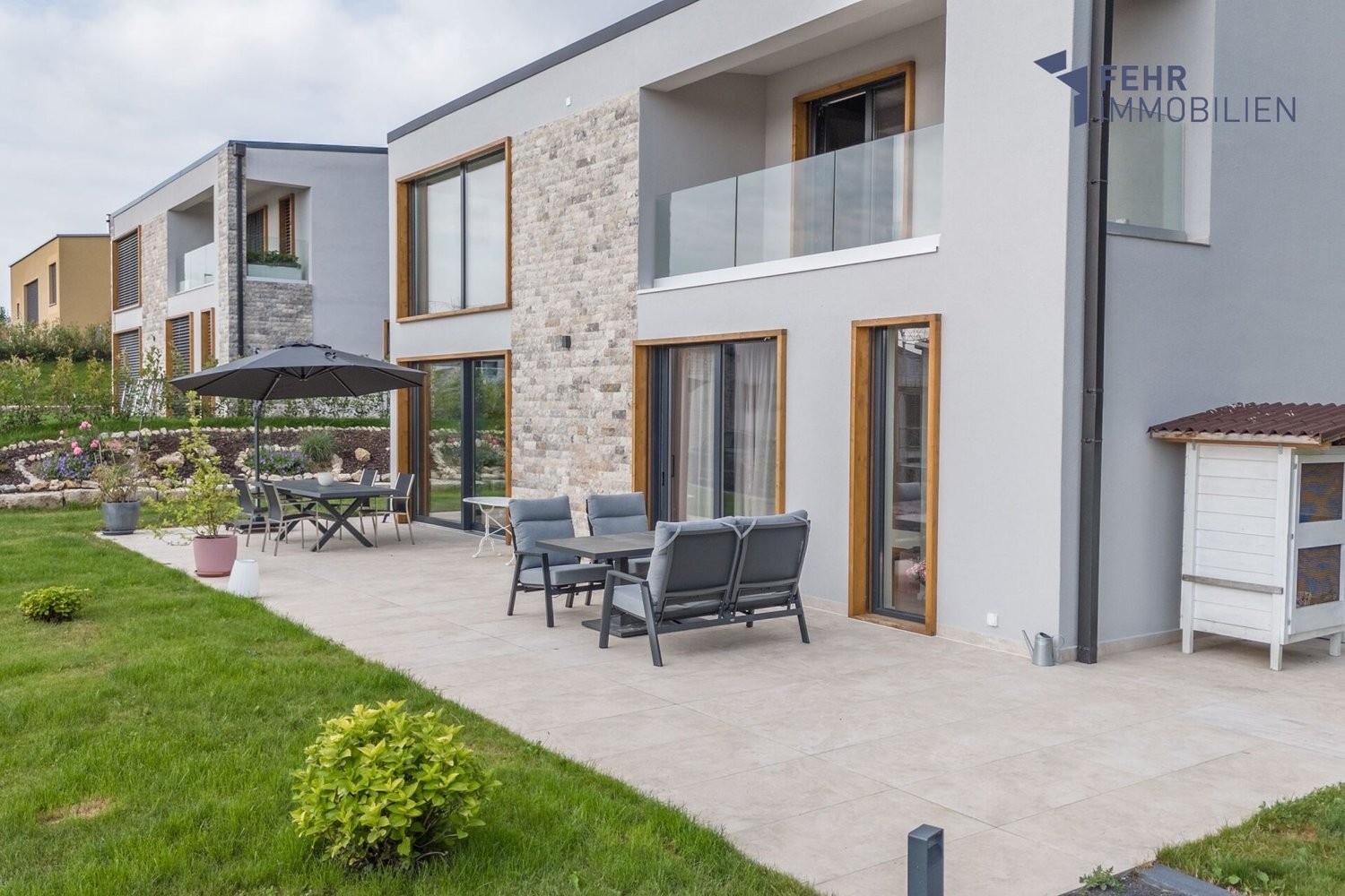 Vor dem Haus wurde eine Grünfläche mit einem Gartensitzplatz und einer automatischen Bewässerungsanlage angelegt. Da das Haus erst kürzlich fertiggestellt wurde, bietet der Gartenbereich Potential für individuelle Gestaltungswünsche und kann nach eigenen Vorstellungen weiter gestaltet werden.