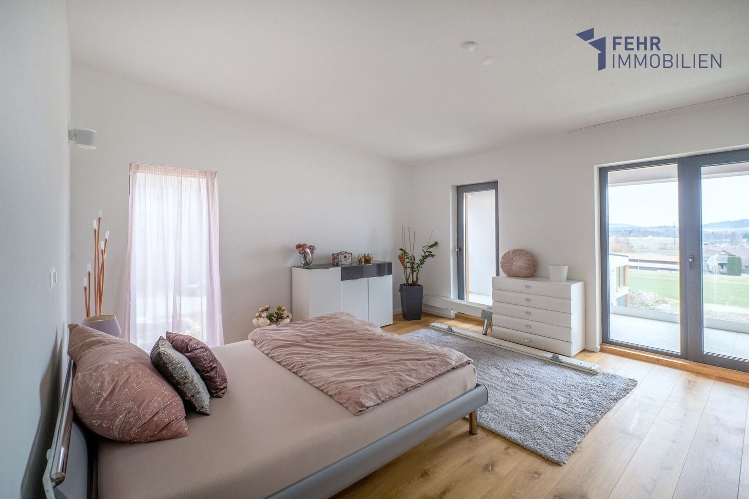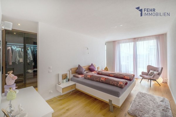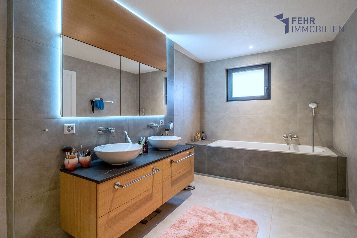 Une chambre spacieuse et élégante avec un fantastique dressing, une salle de bain exclusive avec douche à l'italienne, baignoire, double lavabo et WC ainsi qu'un WC visiteurs raffiné complètent l'offre au rez-de-chaussée.