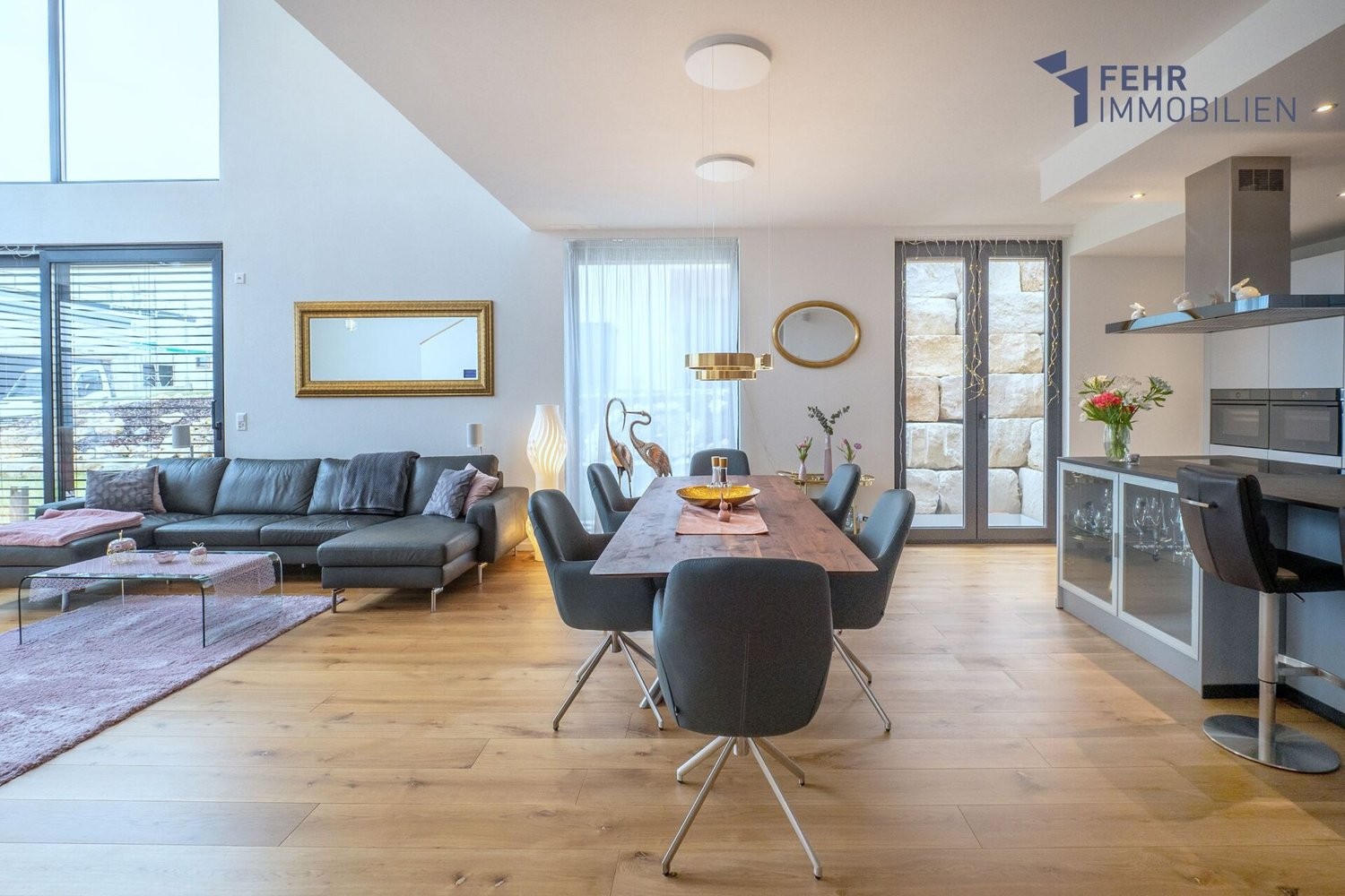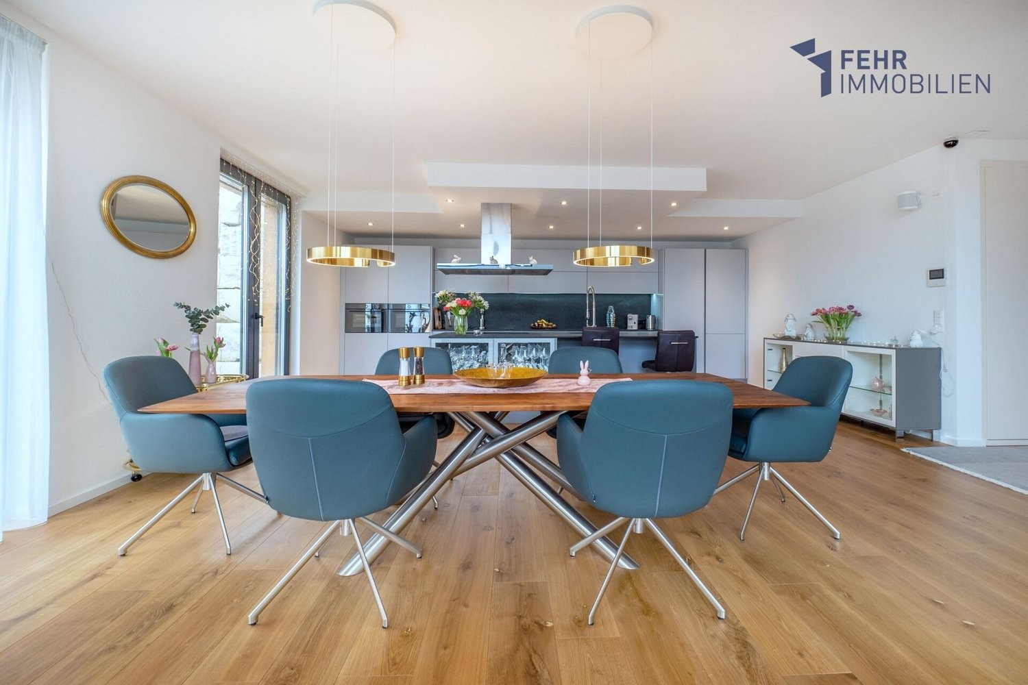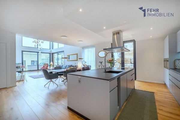 Schliesslich fällt der Blick ins elegante und moderne Wohn-/Esszimmer mit offener Küche. Die top moderne Küche verfügt über eine Kochinsel, hochwertige V-Zug-Geräte und edle Granitsteinarbeitsplatten. Backofen und Steamer befinden sich auf Arbeitshöhe, zahlreiche Schränke bieten grosszügigen Stauraum.