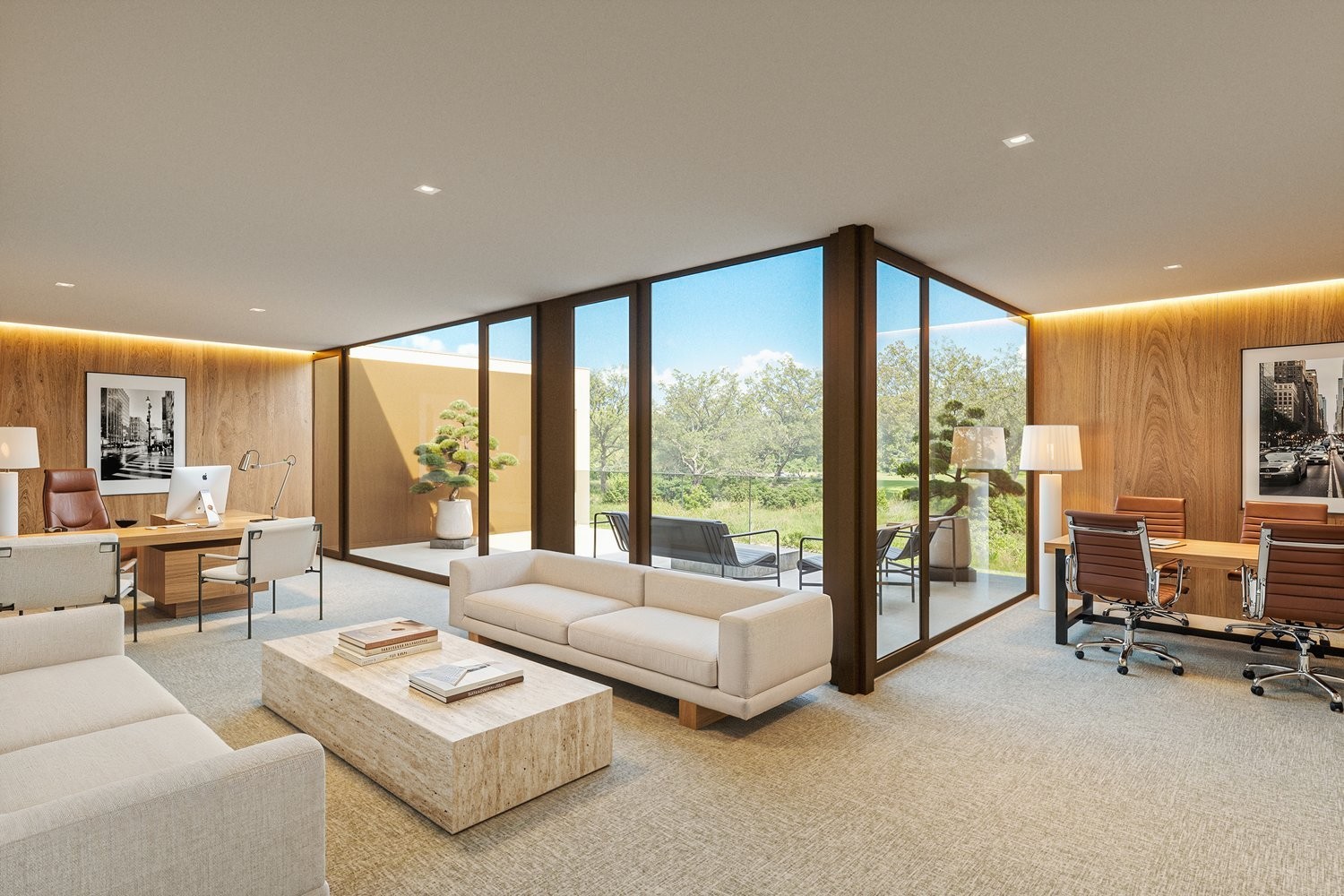 • Architecture contemporaine avec larges baies vitrées et vue sur la verdure. Lumière naturelle grâce à un patio vitrée