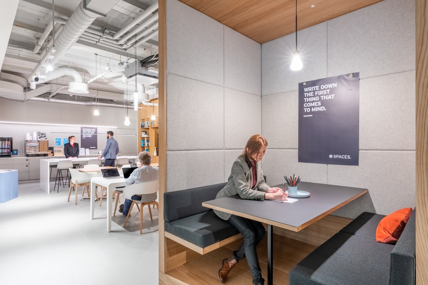 Cette offre comprend 45 m² de bureau privé et meublé avec 110 m² d'espaces partagés : salles de réunion, espace de coworking ouvert, salon, point café et zone de réception avec l'équipement de bureau.