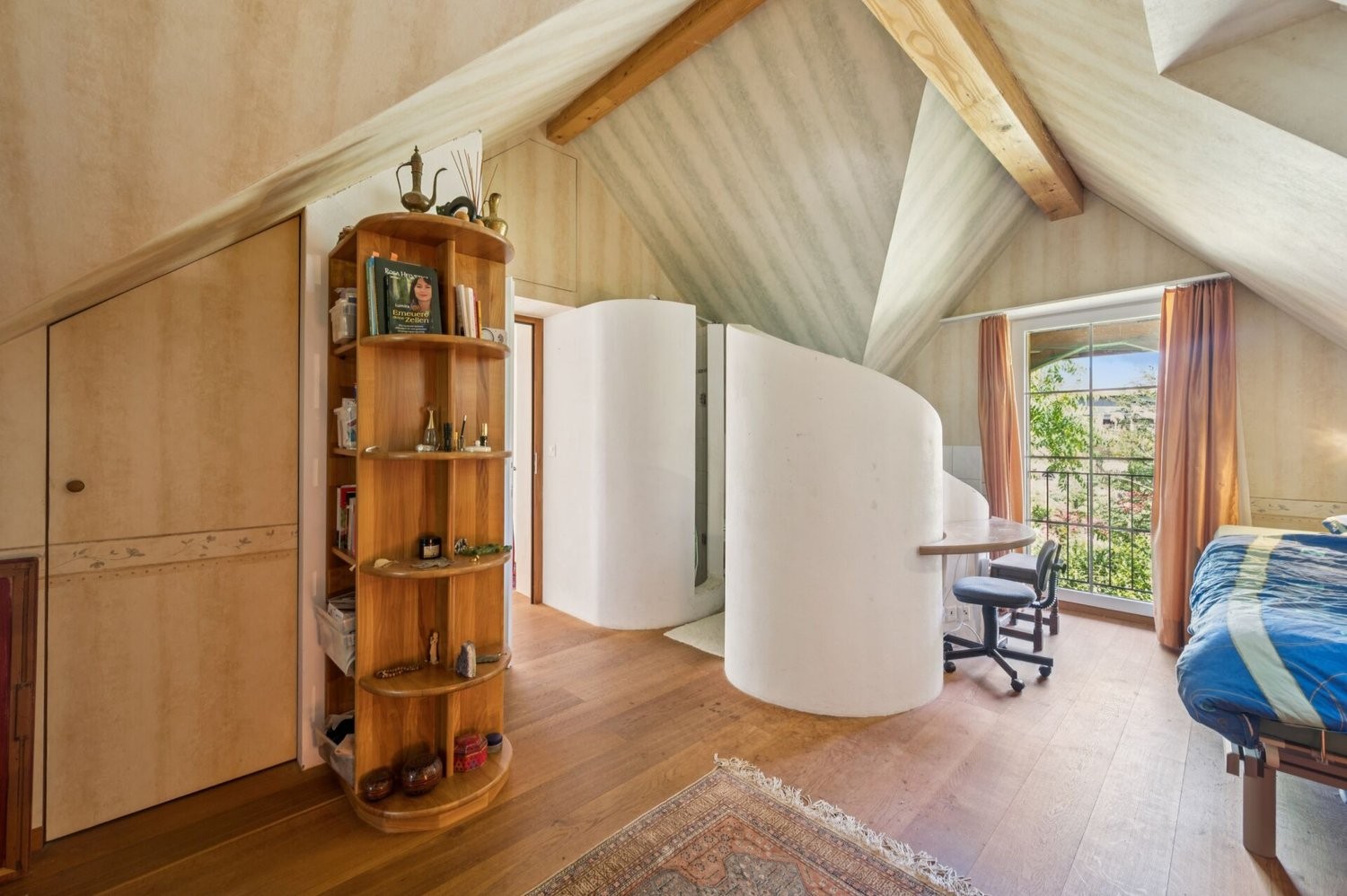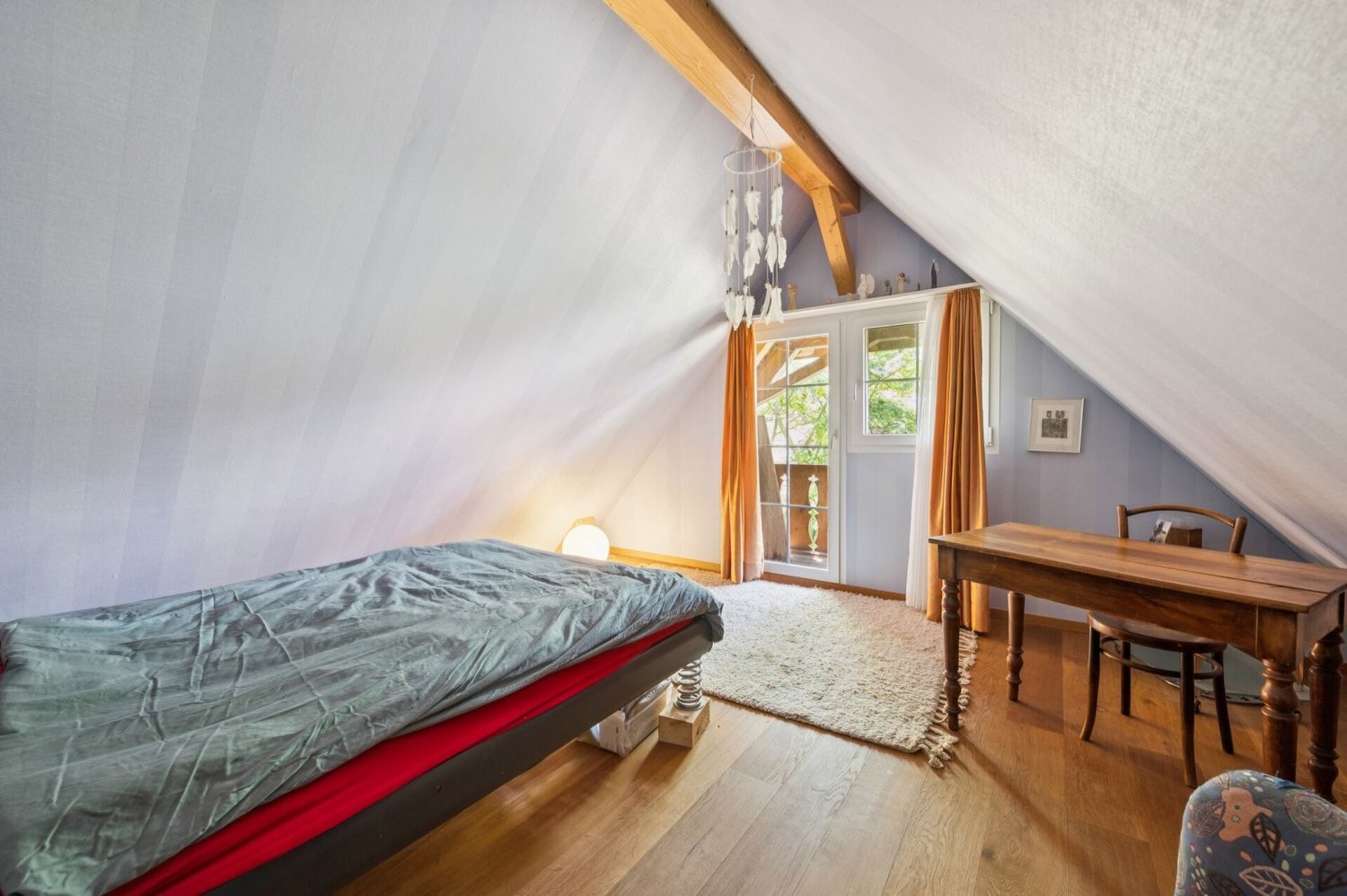 Cette charmante propriété se situe dans un environnement calme, accessible par une allée privée, sur un terrain d'environ 1'100?m². La maison individuelle séduit par sa combinaison harmonieuse de caractère historique et d'éléments modernes et élégants. La répartition bien pensée des espaces offre de nombreuses possibilités d'utilisation sur plusieurs niveaux. Le salon lumineux à l'étage, agrémenté d'une cheminée conviviale, d'un coin repas accueillant et d'une cuisine de qualité aux façades rouges marquantes, crée une atmosphère chaleureuse avec vue sur la verdure. Les combles abritent deux chambres mansardées, dont l'une avec salle de bains attenante. Des pièces annexes pratiques au rez-de-chaussée, un galetas aménageable et un jardin soigneusement entretenu soulignent le potentiel de cette propriété unique - idéale pour les personnes attachées à l'authenticité et sensibles à l'esthétique.