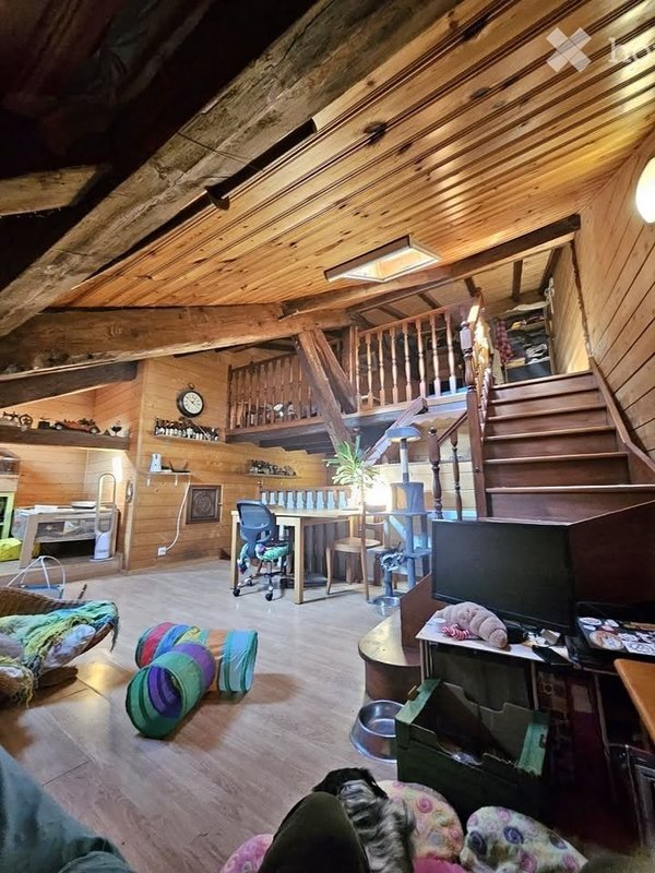 Ensuite quelques marches d'escalier et nous arrivons sur la grande pièce à vivre (la photo) Et pour finir un escalier mène a une grande mezzanine .