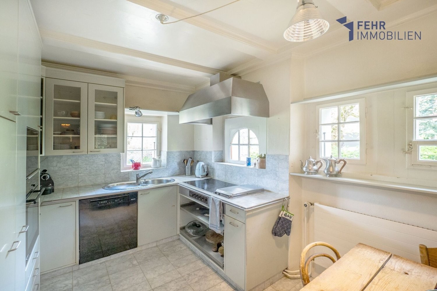 Das Erdgeschoss beherbergt einen grosszügig gestalteten Wohn- und Essbereich, der mit feinen Holzverzierungen versehen ist und beinahe die gesamte Südseite einnimmt. Von hier aus eröffnet sich ein herrlicher Blick in den Garten. Ein historischer, wunderschöner Kachelofen setzt einen besonderen Akzent. Zudem bietet diese Etage ein schönes Büro mit Ausblick in den Garten, ein weiteres Zimmer mit Morgensonne, ein Gäste-WC sowie die Küche.