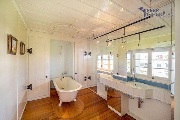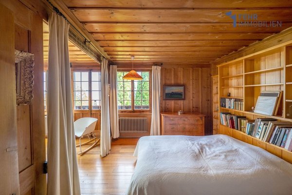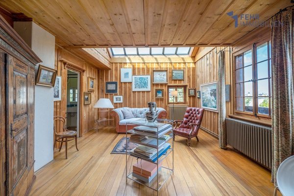 Im Obergeschoss befindet sich das eindrückliche und lichterfüllte Atelier, über eine Doppelschiebetüre verbunden mit dem Schlafzimmer. Ein herrlicher Raum zum Wohlfühlen, Nachdenken, Musizieren und kreativ sein. Angrenzend befindet sich das stilvolle, weiss getünchte Badezimmer zum Träumen, mit freistehender viktorianischer Badewanne sowie Fenstern über dem Waschtisch. Besonders vom Balkon aus geniessen Sie auf dieser Etage eine wunderschöne Aussicht bis hin zum Alpenpanorama.