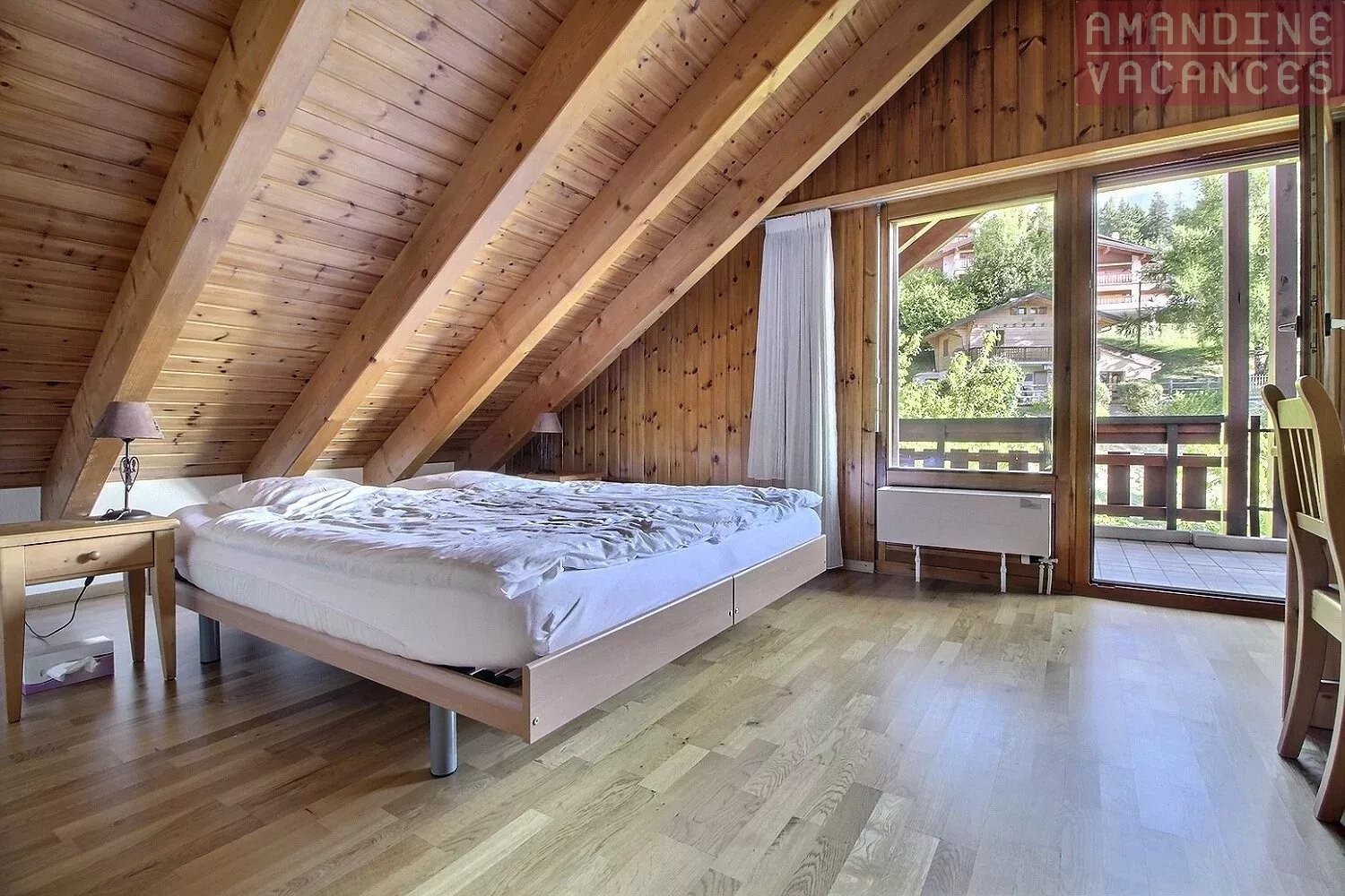 À l'étage, vous découvrirez une très grande chambre mansardée, chaleureuse et pleine de charme, bénéficiant également de son propre balcon. Une petite chambrette avec un lit simple permet d'accueillir un enfant ou un invité. Ce niveau dispose également d'une seconde salle de bain avec douche. Les velux apportent une belle luminosité naturelle tout au long de la journée.