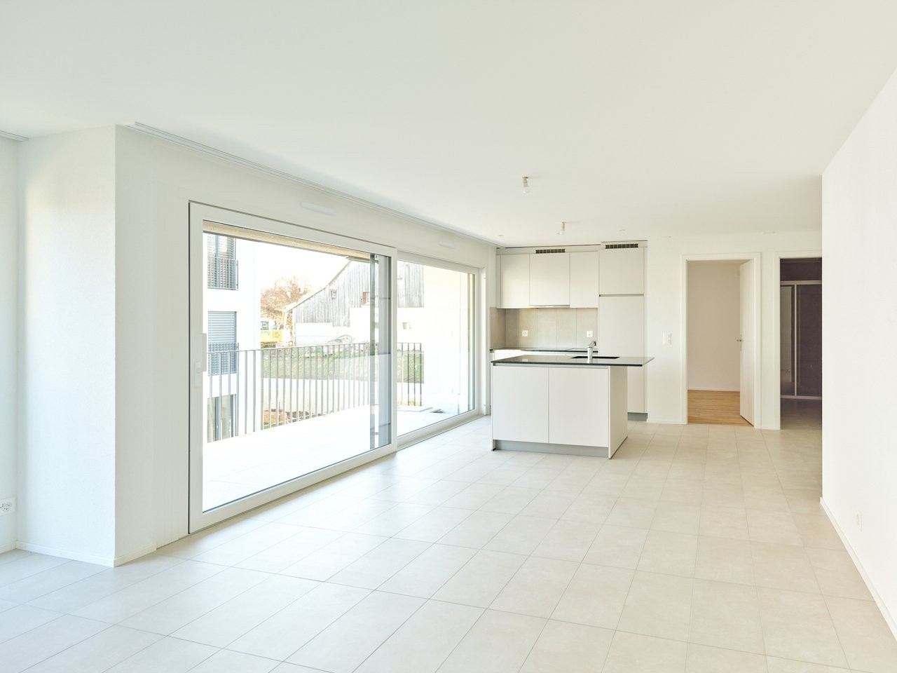 Grand 3.5 pièces de plus de 80m2 au 1er étage d'un immeuble neuf, avec espace de vie agréable et spacieux donnant sur un joli balcon couvert.