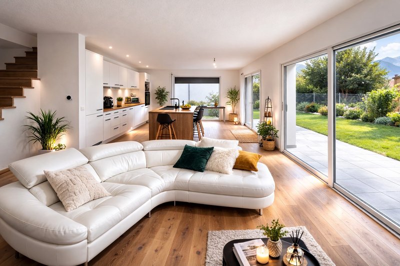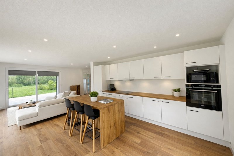 L’espace de vie principal d’environ 38 m² comprend un séjour lumineux avec de larges baies vitrées donnant directement accès au jardin, ainsi qu’une cuisine ouverte contemporaine.