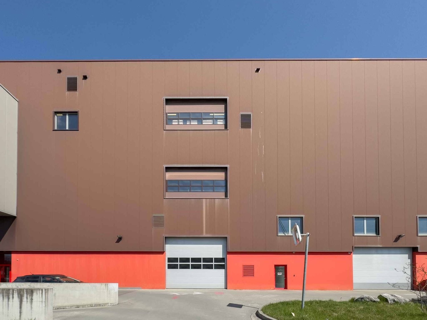 - Porte sectionnelle sur la façade permettant un accès direct depuis l'extérieur, adaptée aux grands volumes (containers, machines industrielles, etc.).