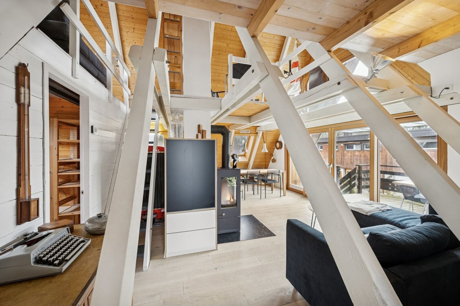 Construite en 1971, la propriété a été régulièrement rénovée et se présente aujourd'hui dans un style soigné et individuel. Avec une surface habitable d'environ 85 m², elle offre un concept d'espace ouvert et lumineux avec beaucoup de bois, de grandes baies vitrées et une charmante galerie. Le séjour principal à l'étage comprend un salon et salle à manger lumineux avec une cheminée élégante et un accès à la terrasse couverte. De là, vous pouvez profiter d'une vue imprenable sur les toits du quartier jusqu'au lac. La cuisine moderne est équipée d'appareils électroménagers de haute qualité, d'une plaque à induction et d'un plan de travail en céramique et s'intègre harmonieusement dans l'ambiance chaleureuse du bois. Deux chambres, une salle de bains élégante avec douche et des débarras pratiques offrent confort et fonctionnalité.