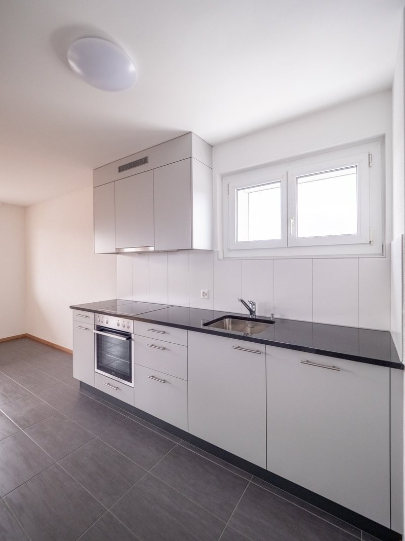 La cuisine entièrement agencée est partiellement ouverte sur un coin à manger/séjour.