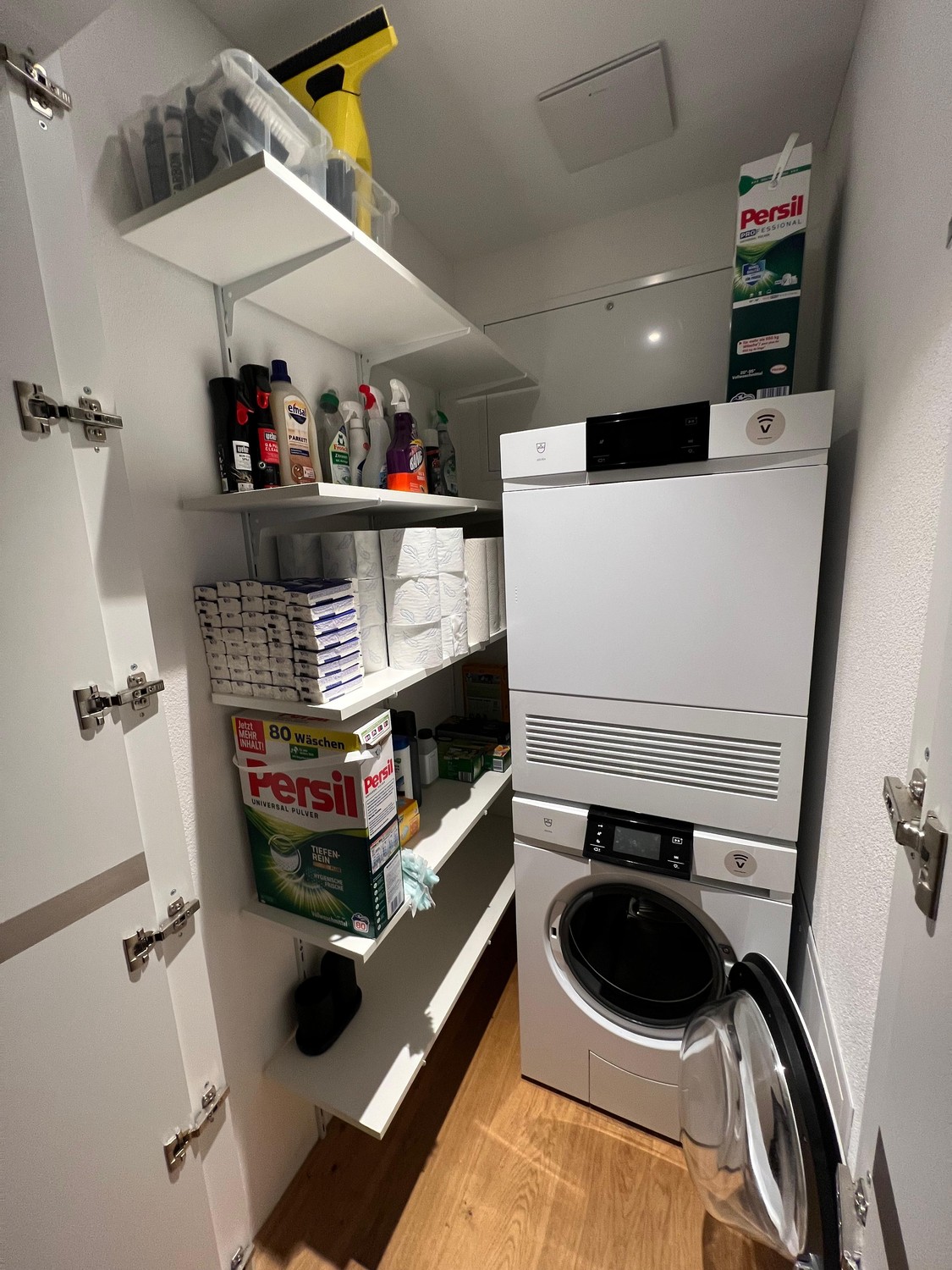 Réduit mit Einbauregal und Waschturm in der Wohnung