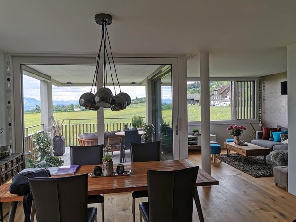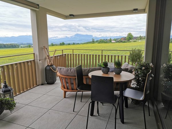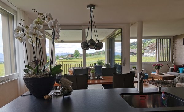 Von Terrasse, Wohn-Essbereich und Küche eröffnet sich ein weiter Blick über Wiesen und Wälder bis zur Alpenkette. Dieses Panorama ist nicht nur Kulisse, sondern Teil des täglichen Wohngefühls.