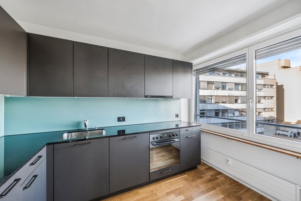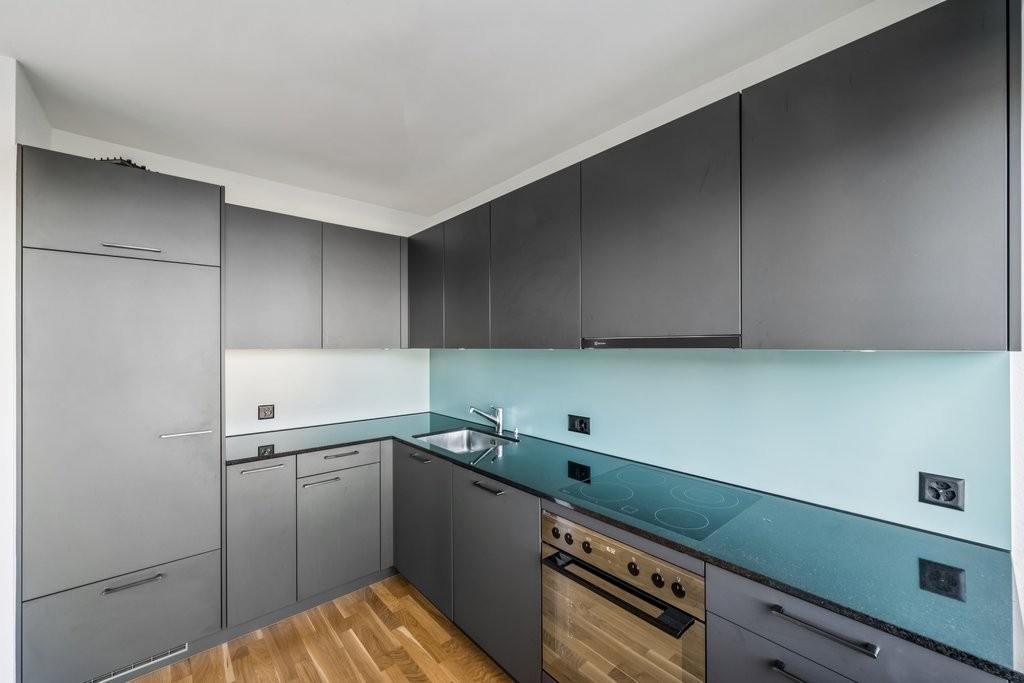 Küche mit Geschirrspüler, Glaskeramikkochfeld und hochliegendem Backofen