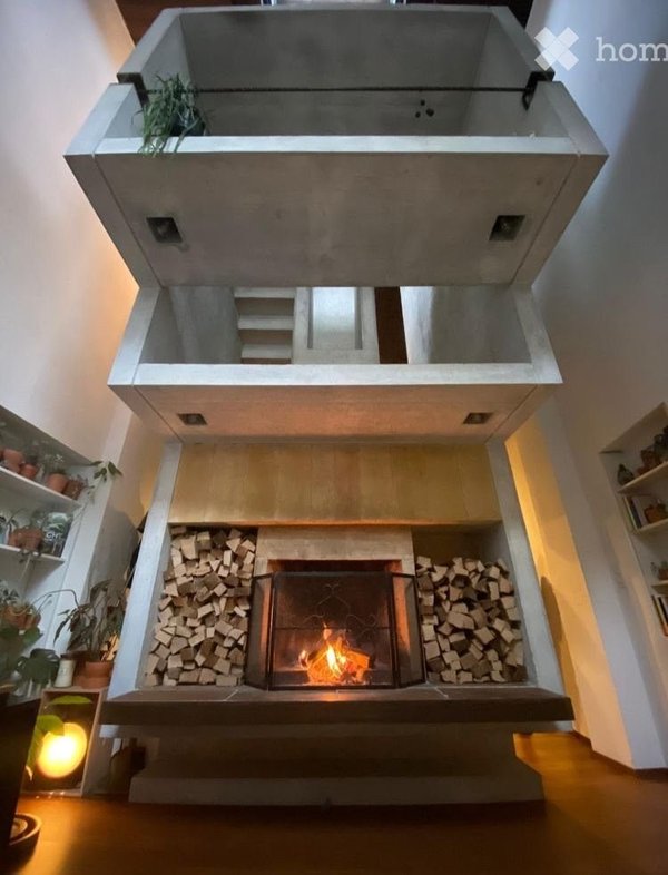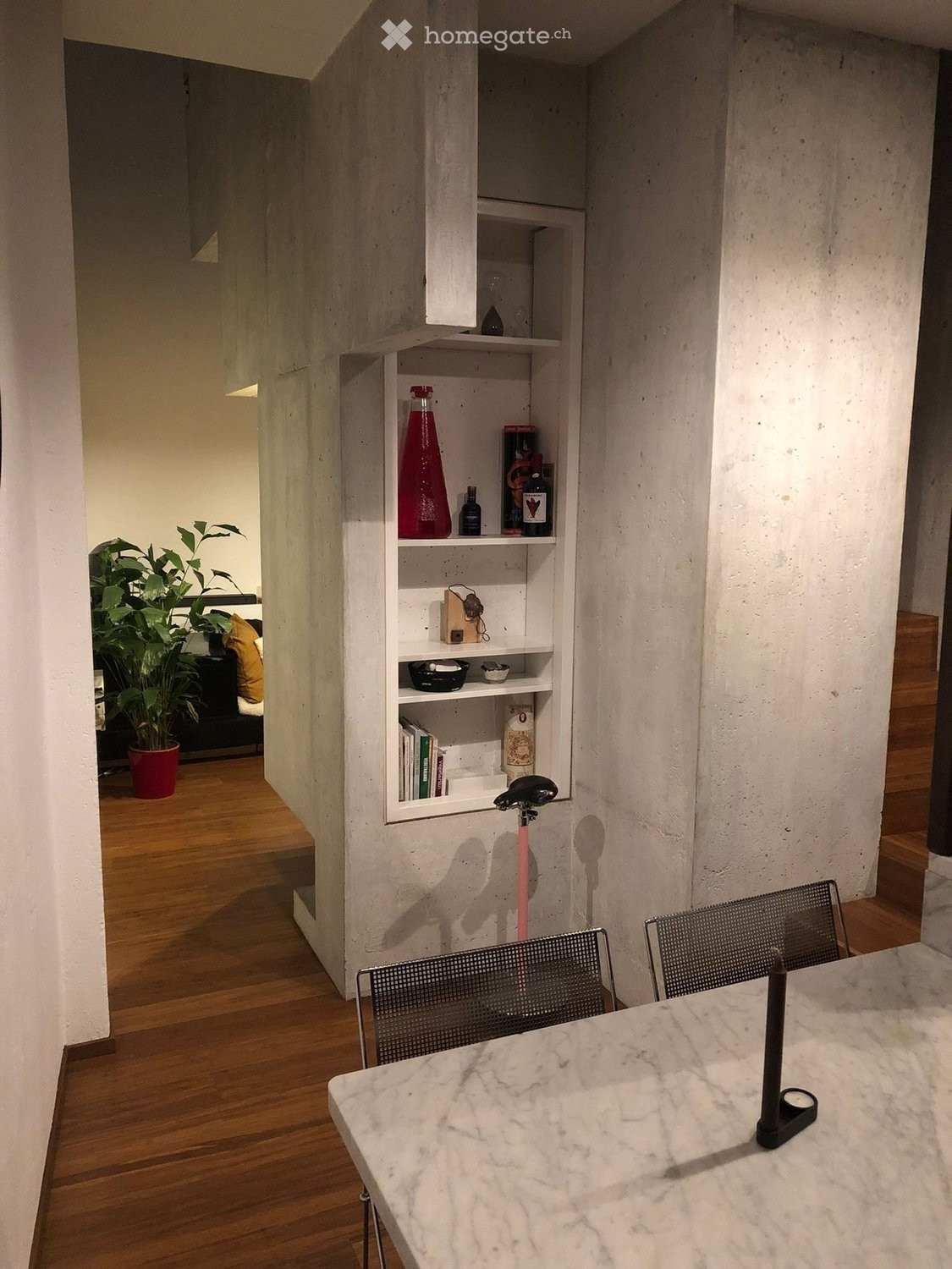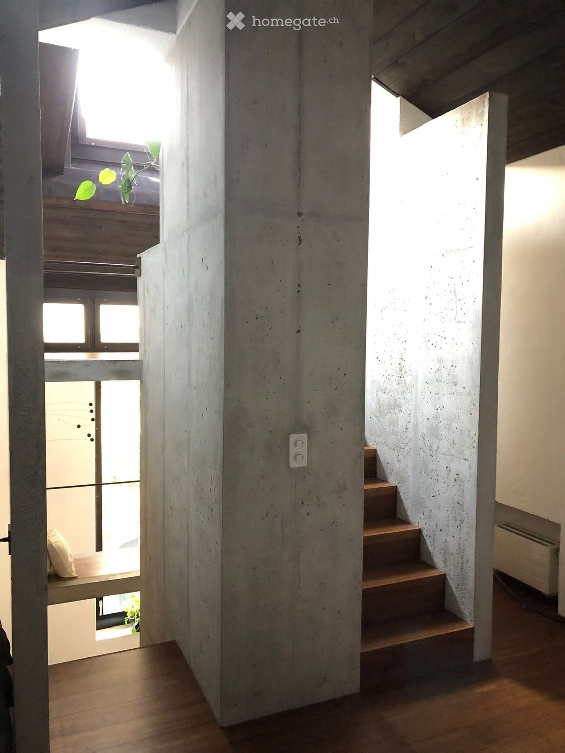 L'appartamento è composto da una struttura interna in beton che separa i locali e che si sviluppa su 2 piani.