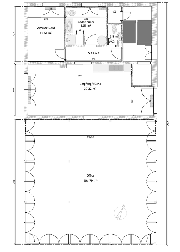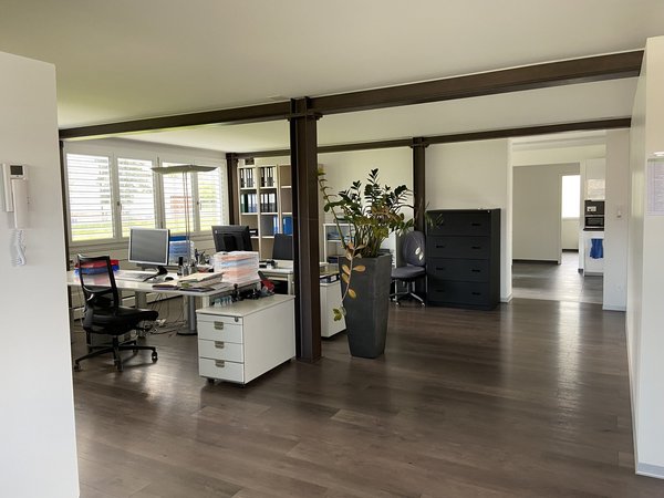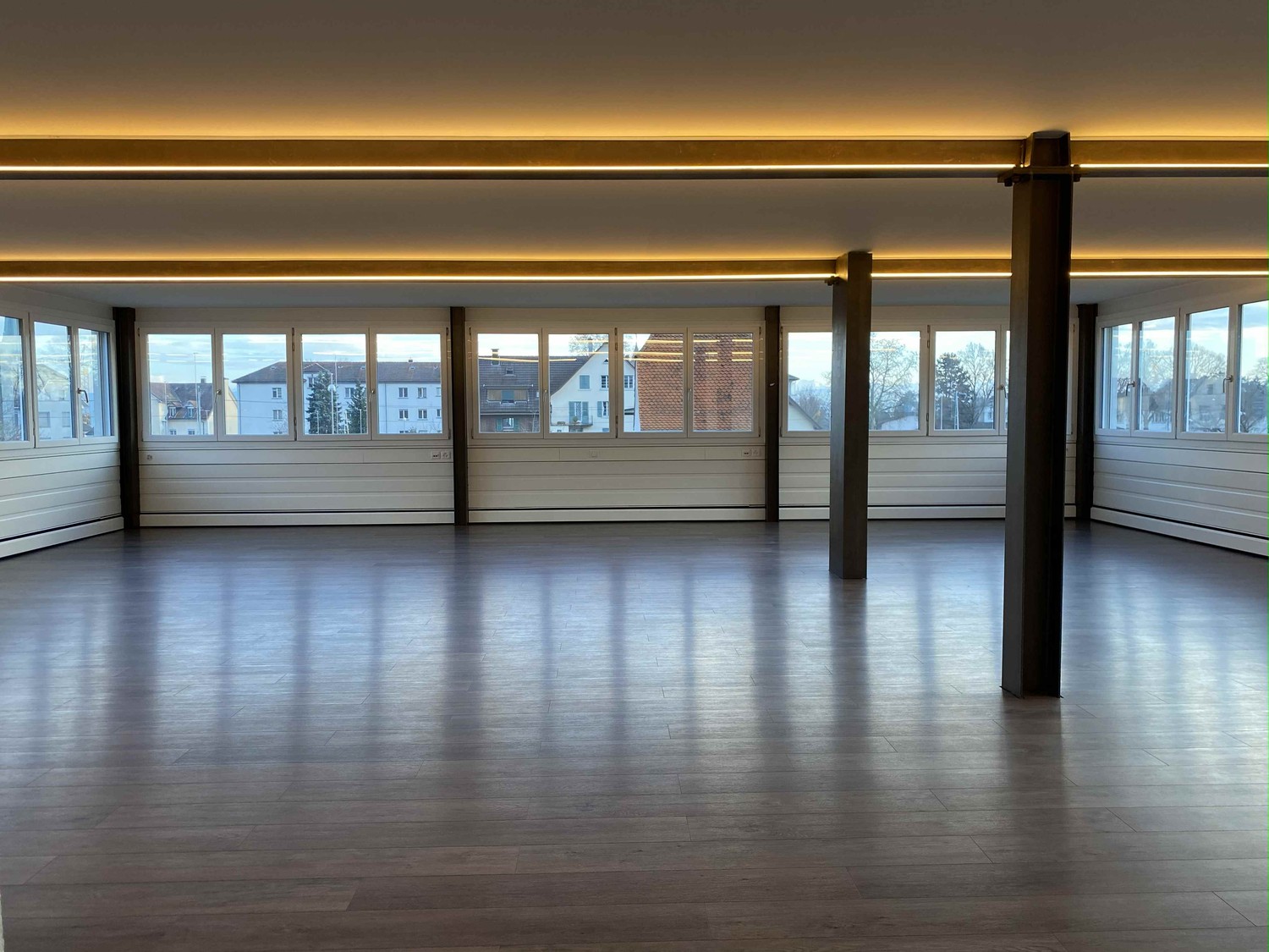• Einen grosszügigen, loftartigen Bürobereich, der sich sowohl als Grossraumbüro eignet als auch flexibel in kleinere Einheiten unterteilt werden kann