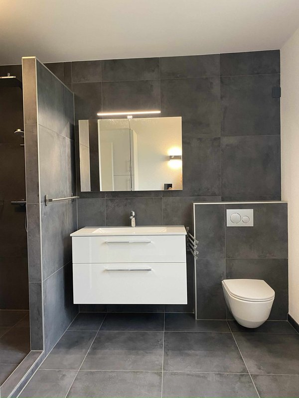• Zwei modern gestaltete Badezimmer mit grauen Keramikplatten und begehbarer Dusche