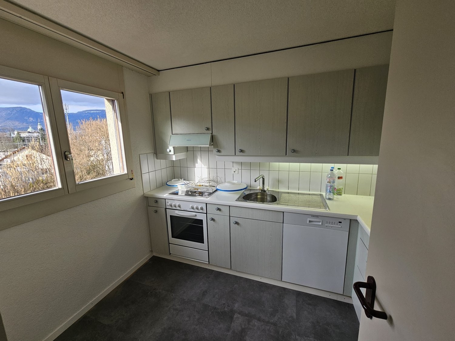 Küche mit Glaskeramikherd, Dampfabzug, Backofen, Geschirrspüler, Kühlschrank mit Gefrierfach und viel Stauraum