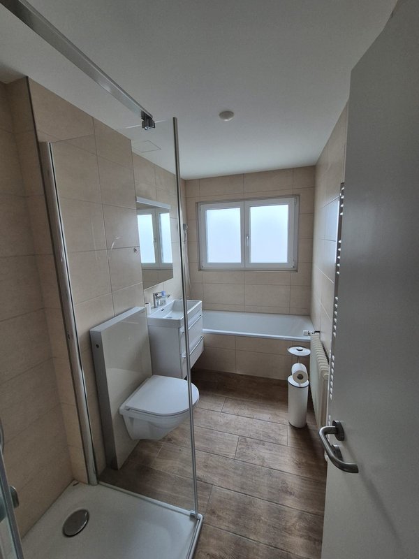Badezimmer mit Dusche, Badewanne, Lavabo und WC