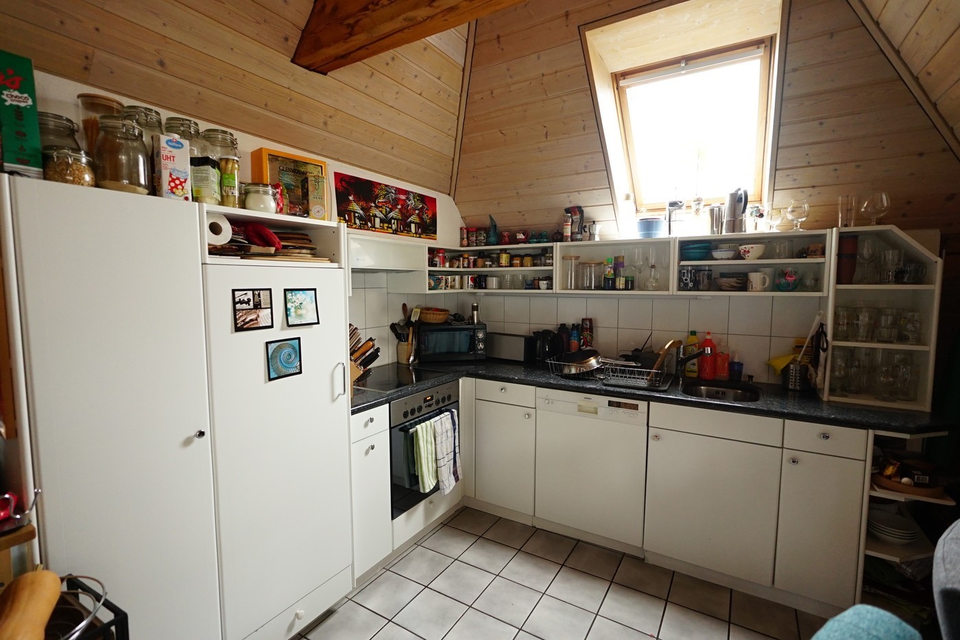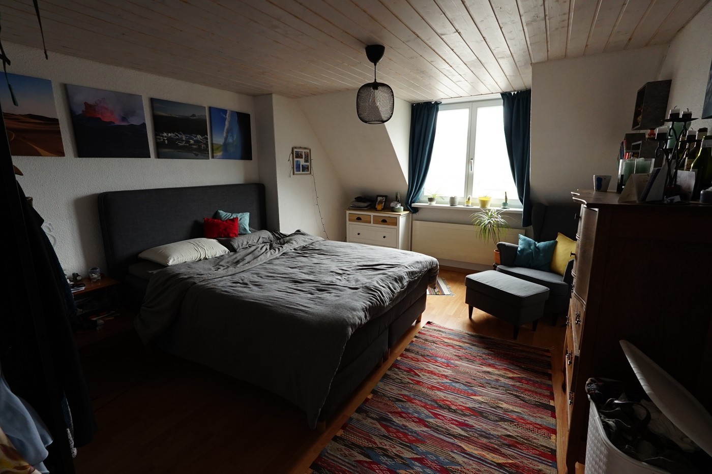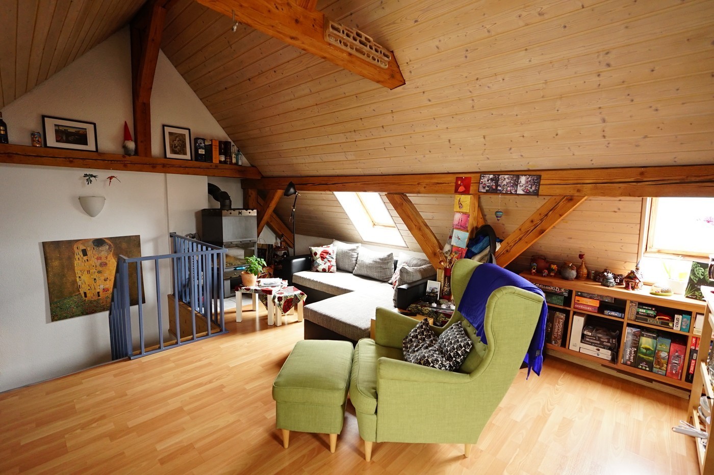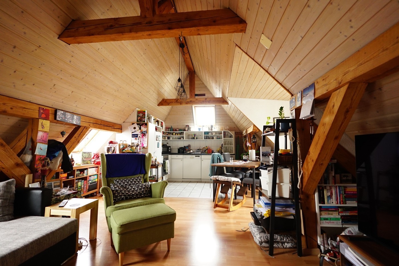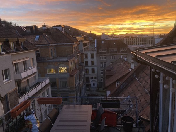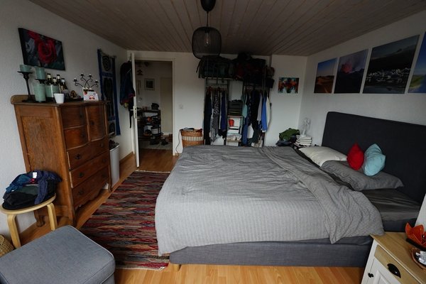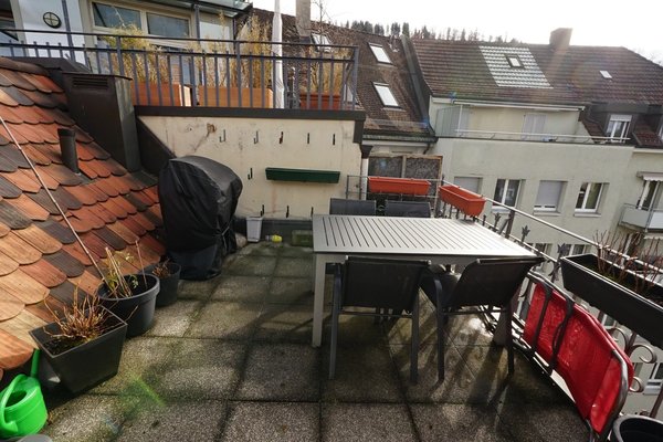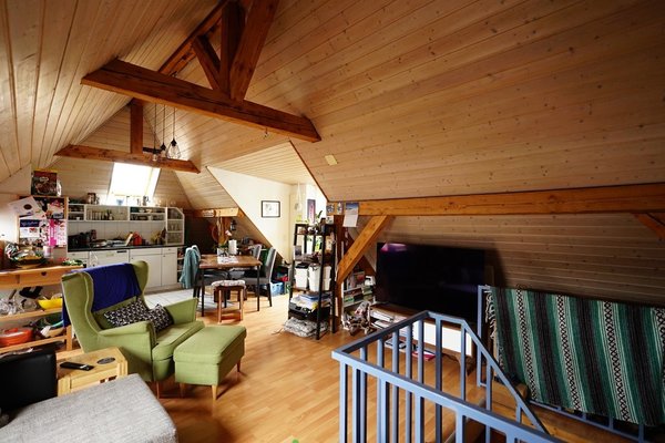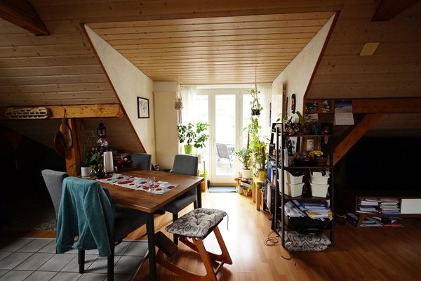 We are moving away from St. Gallen for professional reasons and would like to vacate our very cool maisonette penthouse apartment on February 1, 2026. The apartment is located near Neumarkt on a quiet street on the top floor. It is a maisonette with two rooms and a bathroom on the lower level and a huge eat-in kitchen with a chimney and terrace on the upper level. The exposed roof beams on the upper level give the apartment its special charm.