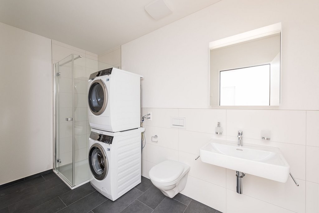 - Modernes Badezimmer mit WC, Lavabo, Spiegelschrank, Badewanne und eigenem Waschturm (Waschmaschine und Tumbler)
