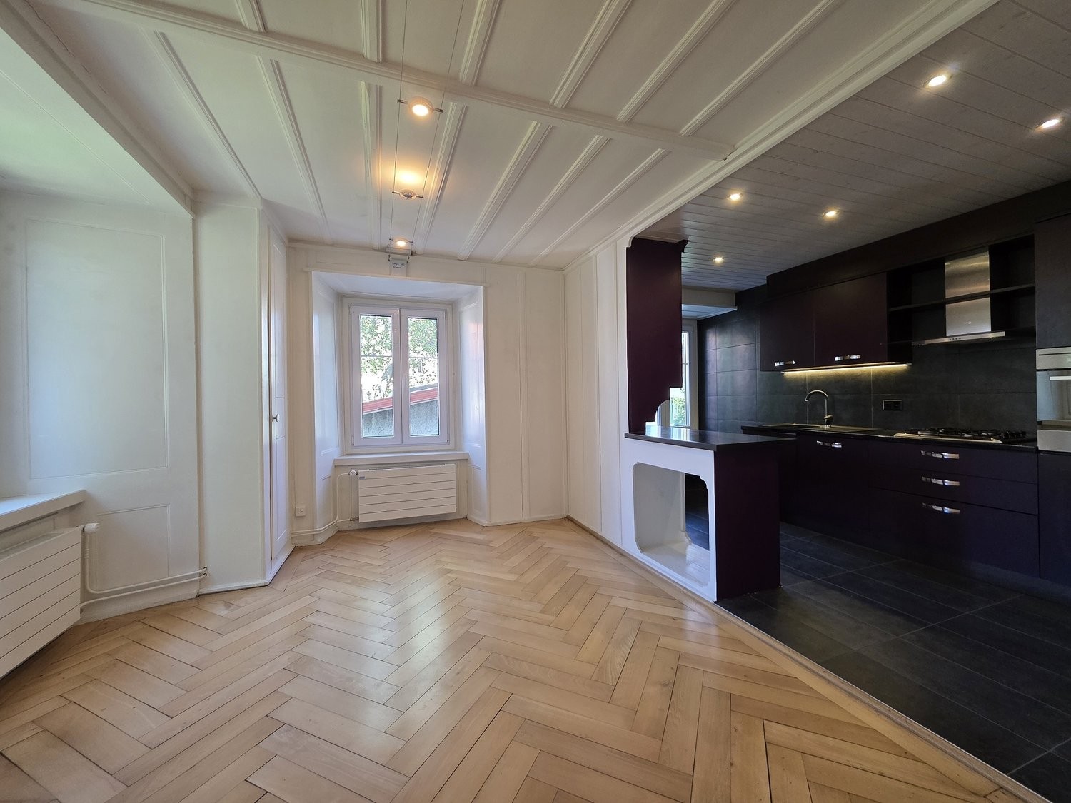 Cuisine agencée avec lave-vaisselle ouverte sur salon-salle à manger avec parquet , salle de bains/WC avec baignoire et douche à l'italienne, hall, 2 chambres avec parquet, dépendance, jardin commun, chauffage central.