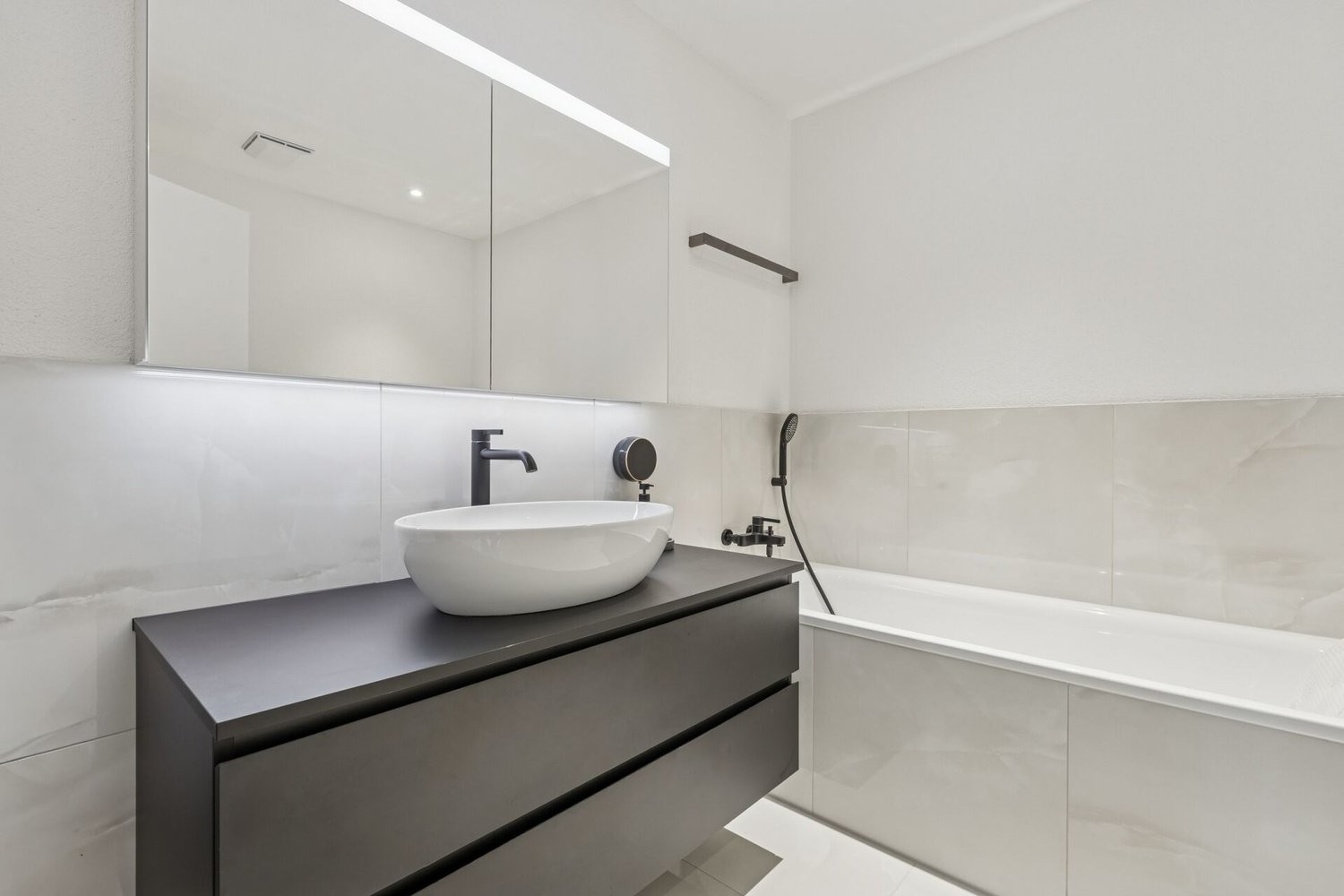 Vier gut proportionierte Räume gewähren vielseitige Nutzungsmöglichkeiten als Schlaf-, Kinder-, Gäste- oder Arbeitsbereich. Die Kombination aus Keramikplatten in den Wohnzonen und Laminat in den Zimmern sorgt für ein stimmiges Gesamtbild. Zwei stilvoll ausgebaute Badezimmer, eines mit Dusche und eines mit Badewanne, gewährleisten hohen Komfort im Alltag. Die angenehme Raumhöhe von 2.40 Metern sowie die Fussbodenheizung mit moderner Sole-Wasser Wärmepumpe widerspiegeln das hochwertige Wohngefühl.