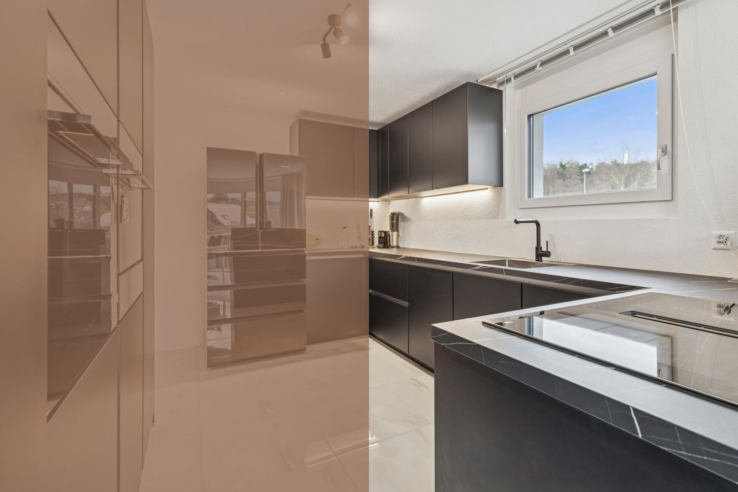Die moderne Küche überzeugt mit klaren Linien und hochwertiger Ausstattung. Dunkle Fronten treffen auf eine elegante Arbeitsfläche, ergänzt durch Induktionskochfeld mit integriertem Muldenlüfter, Backofen, Combi- Steamer, Wärmeschublade sowie grosszügigen Kühl- und Gefrierschrank. Die durchdachte Anordnung der Elemente ermöglicht effiziente Abläufe und unterstreicht den zeitlosen Charakter des Innenausbaus.