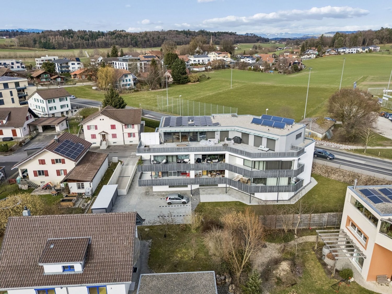 Die Zufahrt zur Liegenschaft erfolgt bequem über das Doktorgässli, wo eine übersichtliche Einfahrt direkt zur unterirdischen Einstellhalle führt. Dort steht Ihnen ein eigener Einstellhallenparkplatz zur Verfügung, der für CHF 30'000.- dazu erworben werden kann und gedecktes Parkieren ermöglicht. Von der Garage aus gelangen Sie wettergeschützt ins Gebäude. Ein Lift verbindet alle Geschosse komfortabel miteinander und bringt Sie direkt bis vor die Wohnungstüre.
