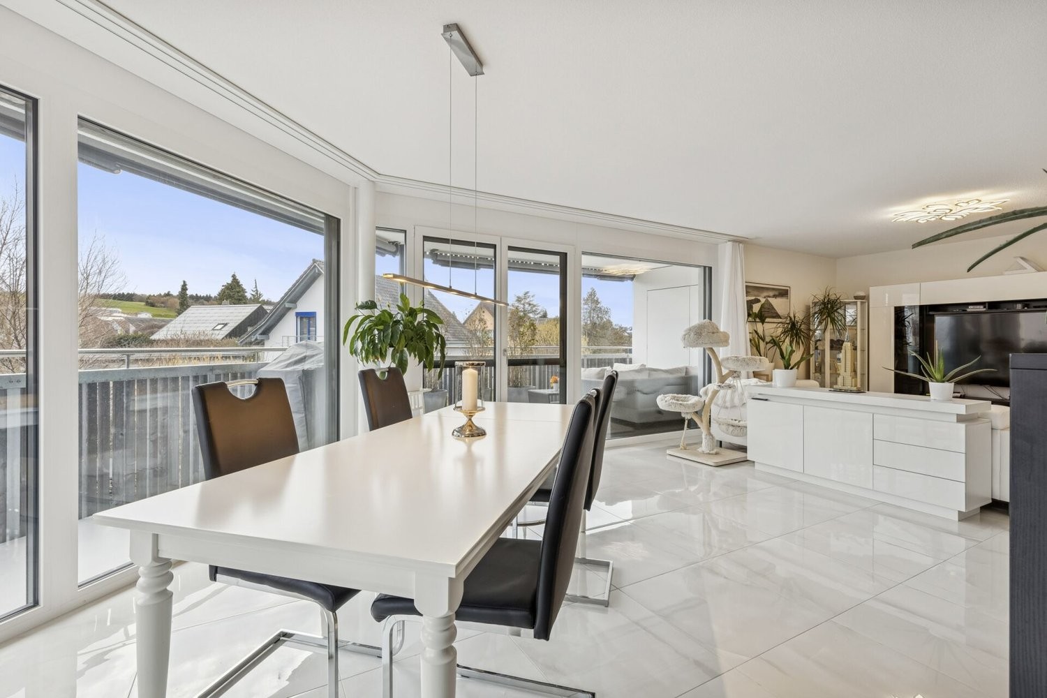 Bereits beim Betreten der Wohnung wird die Grosszügigkeit spürbar. Ein weitläufiger Korridor mit über 20 Quadratmetern verbindet die einzelnen Bereiche auf elegante Weise und schafft eine klare Struktur. Der lichtdurchflutete Wohn- und Essbereich bildet das Herzstück der Wohnung. Grosszügige Fensterfronten sorgen für viel Tageslicht und schaffen einen harmonischen Übergang zum rund 21 Quadratmeter grossen Balkon, der ausreichend Platz für eine stilvolle Möblierung bietet. Hier geniessen Sie sonnige Stunden mit Blick ins Quartier und auf die umliegenden Grünflächen.