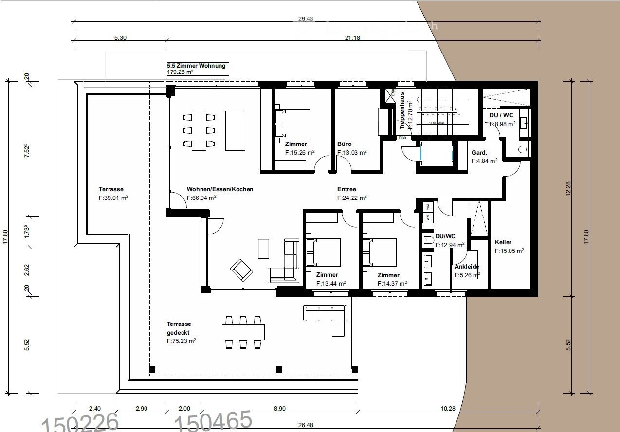Die Wohnung verfügt über 4 Schlafzimmer, Wohnküche mit Kochinsel (Hochwertige Küchengeräte und Steamer mit Direktwasseranschluss), Wohnzimmer, 2 Nasszellen mit Duschen, Ankleideraum und einen zusätzlichen Mieterkeller in der Wohnung. Die Wohnfläche beträgt 179.28 m2, der gedeckte Balkon mit 75.23 m2 der ungedeckte Balkon mit 39.01 m2. Im Erdgeschoss ist der Mieterkeller mit 9.3 m2. Lift mit Direktzugang in die Wohnung. Inklusive 2 Parkplätze in der Einstellhalle. Diverse Einbauschränke und Garderobenschränke verleihen der Wohnung zusätzlichen Komfort.