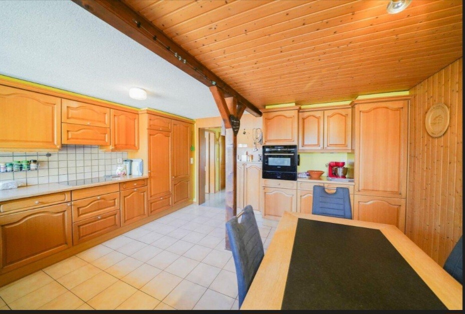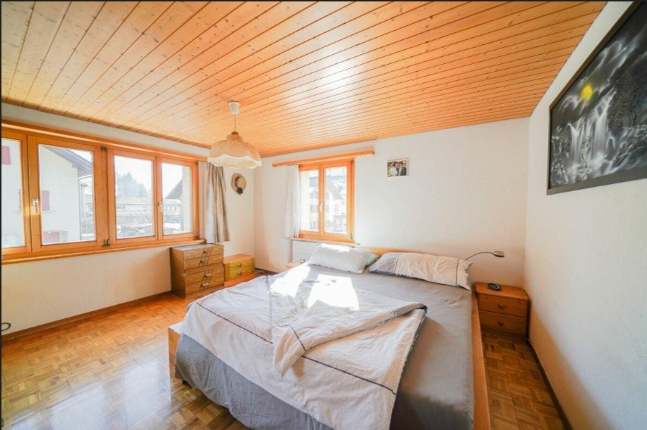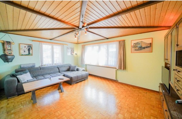 Die grosszügige Wohnung ist in einem 3 Familienhaus und erstreckt sich auf 2 Etagen. Im 1. OG befinden sich die Wohnküche, das Wohnzimmer, Elternschlafzimmer, ein kleineres Zimmer/Büro das 1. Badezimmer mit Badewanne und die große Terrasse. Im Dachgeschoss sind drei Zimmer, das 2. Badezimmer mit Dusche und 2 Estriche. Zur Wohnung gehören auch ein grosser Keller und ein Autoabstellplatz. Eine Garage kann für sFr. 120.- dazu gemietet werden.