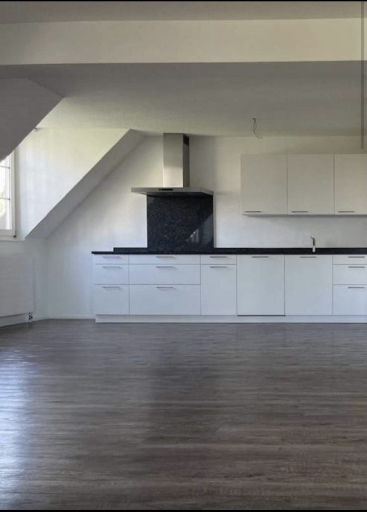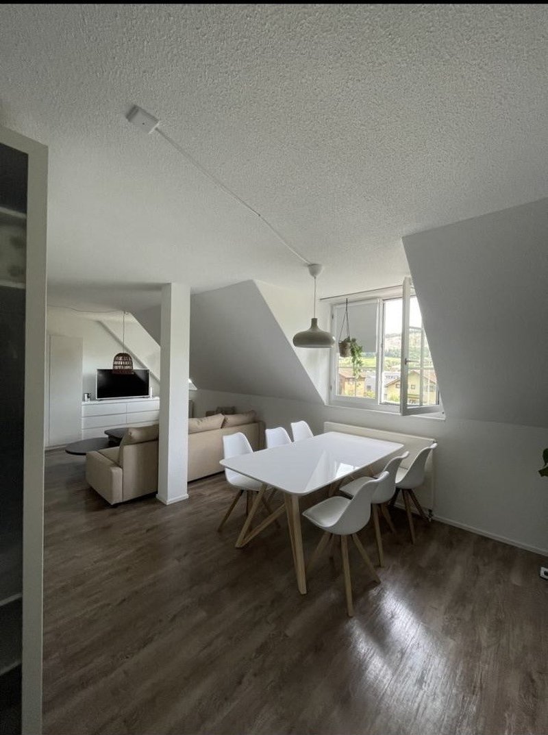 Die grossen Fenster sorgen für viel Tageslicht und schaffen eine angenehme Wohnatmosphäre. Die Dachschrägen verleihen der Wohnung besonderen Charakter und machen sie zu einem stilvollen Rückzugsort.