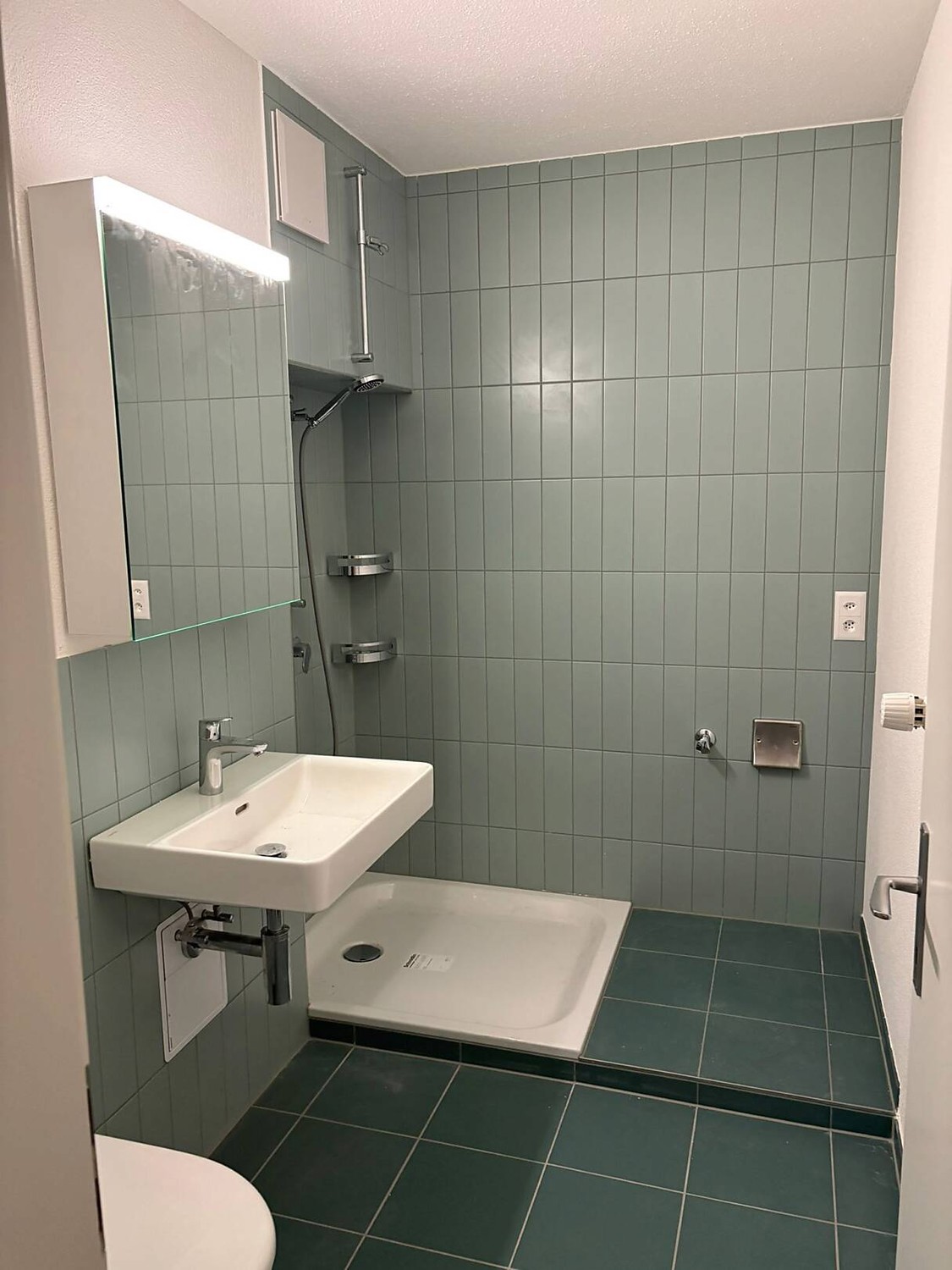 Modernem Badezimmer: Stilvolles Design mit grauen und grünen Fliesen
