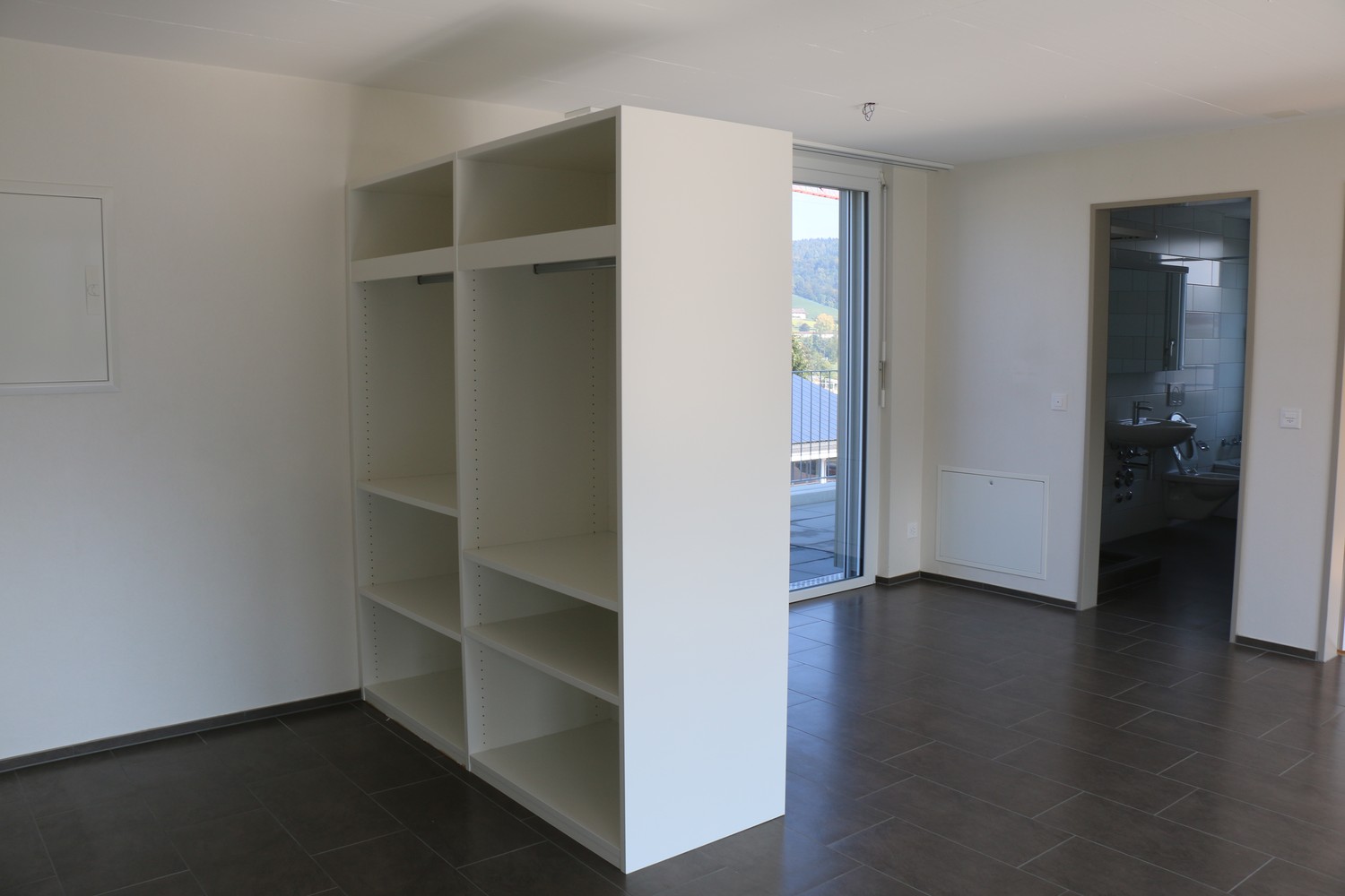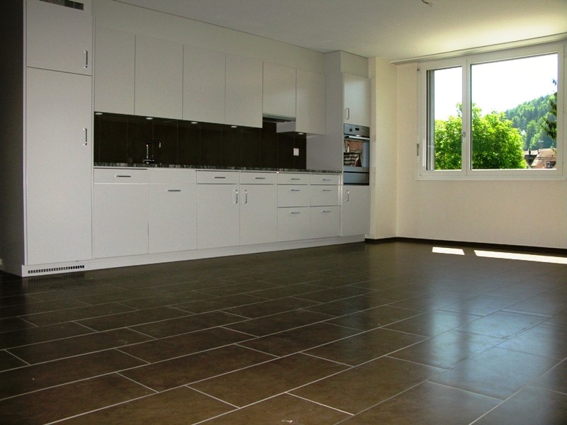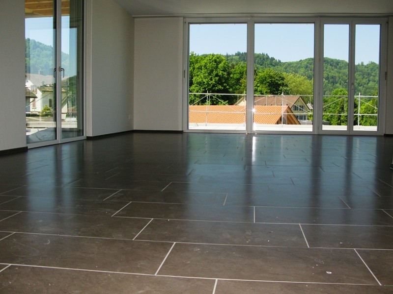 graue Plattenböden in Korridor, Küche und Nasszellen