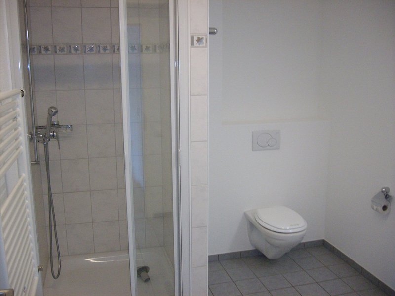 Das Badezimmer verfügt über eine Dusche und ein WC.